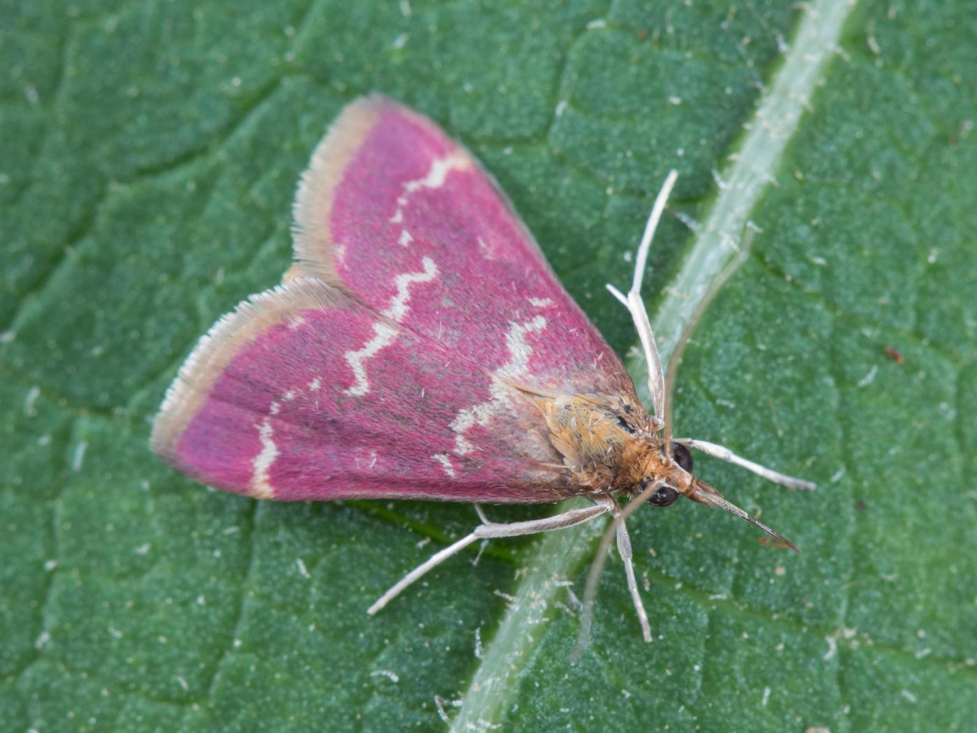 Adulte : envergure des ailes de 18,0 à 22,0 mm; la tête et le thorax sont beiges; les ailes antérieures sont rose foncé et traversées de deux lignes beiges en zigzag; les ailes postérieures sont brunâtres; les palpes labiaux sont contigus et projetés vers l'avant, ce qui donne l'impression qu'une protubérance conique est présente à l'avant de la tête.