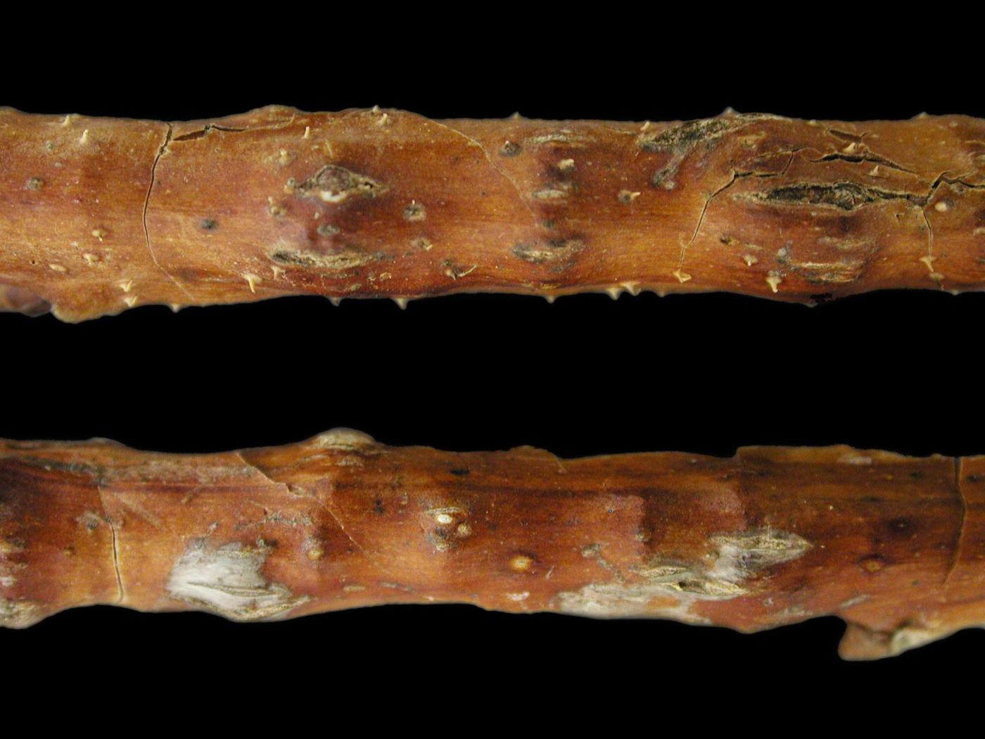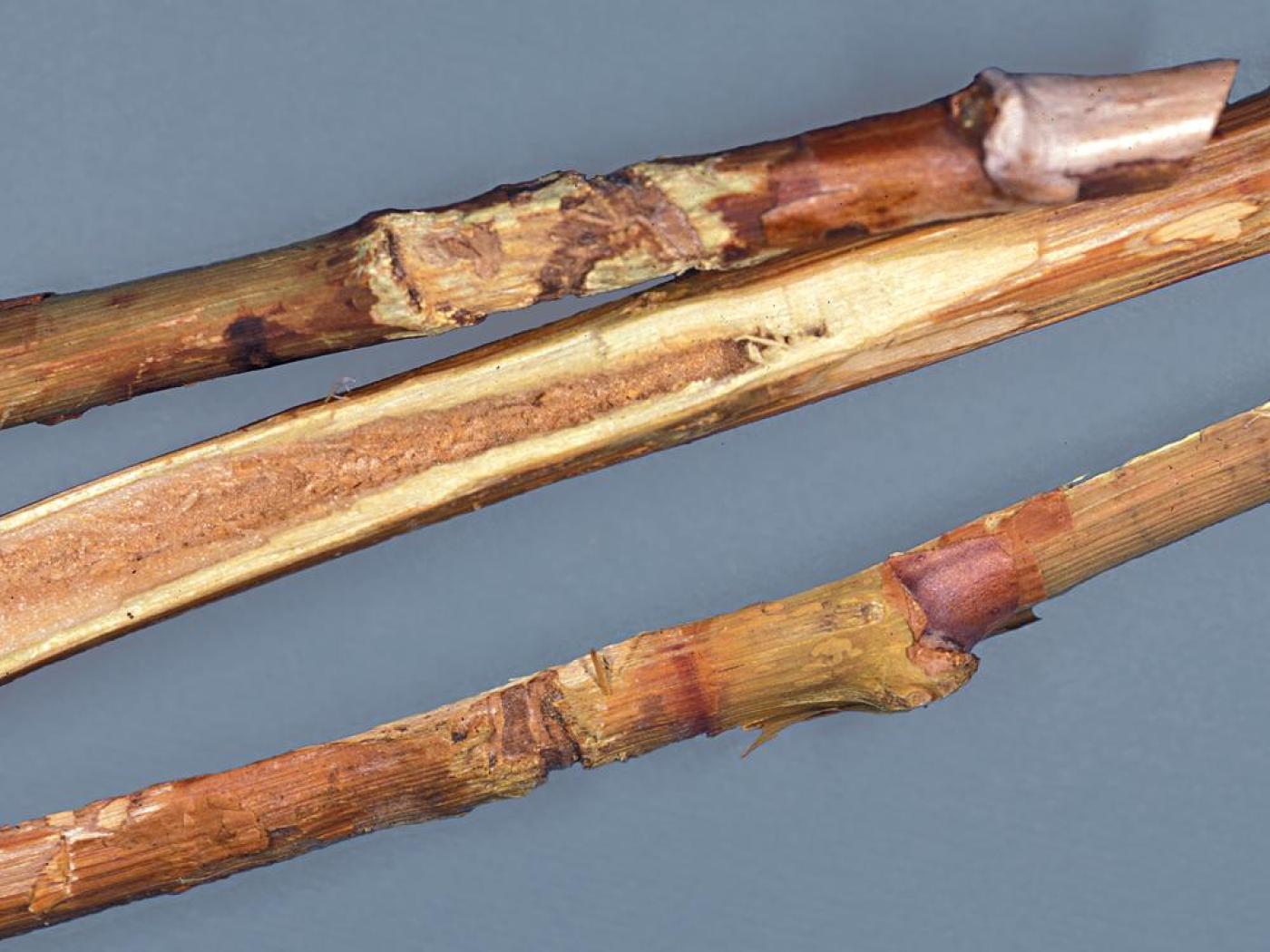 Description: Canne fructifère de framboisier présentant des dommages causés par la larve de l'agrile du framboisier. Ce symptôme est occasionné lors de la première année de croissance de la canne. La jeune larve creuse un tunnel en spirale autour de la tige au niveau du cambium. À un stade plus avancé, elle s'enfonce dans la moelle en minant une galerie en zigzag. Les plants attaqués présentent des renflements et l'écorce est fendillée. Les tiges se dessèchent de haut en bas et les tiges minées cassent facil… En savoir plus