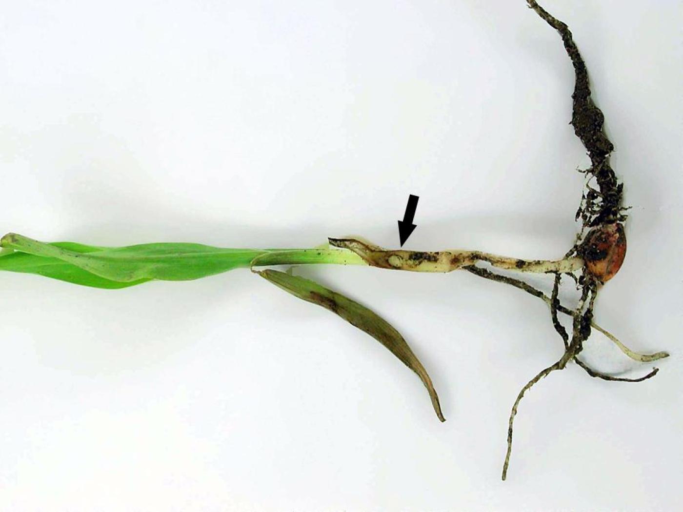 Description: Jeune plant de maïs présentant des dommages causés par les vers fil-de-fer du genre Agriotes : les vers fil-de-fer s'alimentent des parties souterraines des plants de maïs. Des trous et des galeries sont donc parfois observables au niveau du collet.