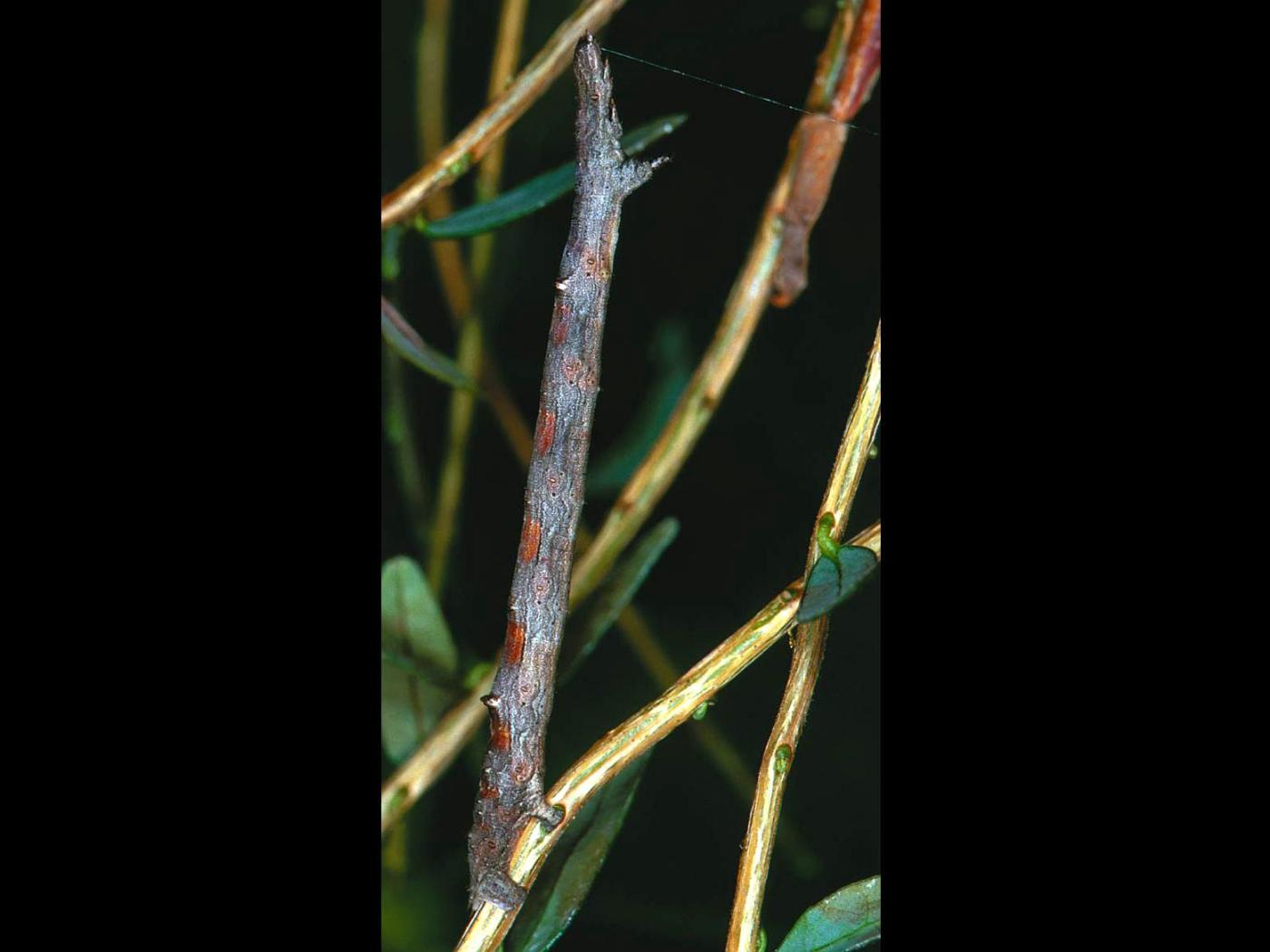 Larve : 40,0 à 45,0 mm à maturité; le corps est gris avec six taches dorsales rougeâtres plus ou moins carrées; deux tubercules dorsaux sont disposés sur les segments abdominaux un et cinq.