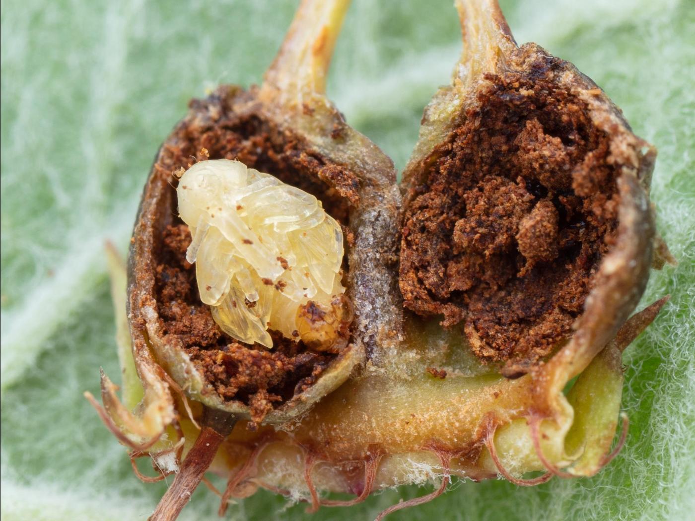 Larve : 7,5 à 9,0 mm à maturité; le corps est recourbé, sans pattes et recouvert de petites aspérités; la coloration est blanc crème; la tête est brun pâle; les mandibules sont foncées.