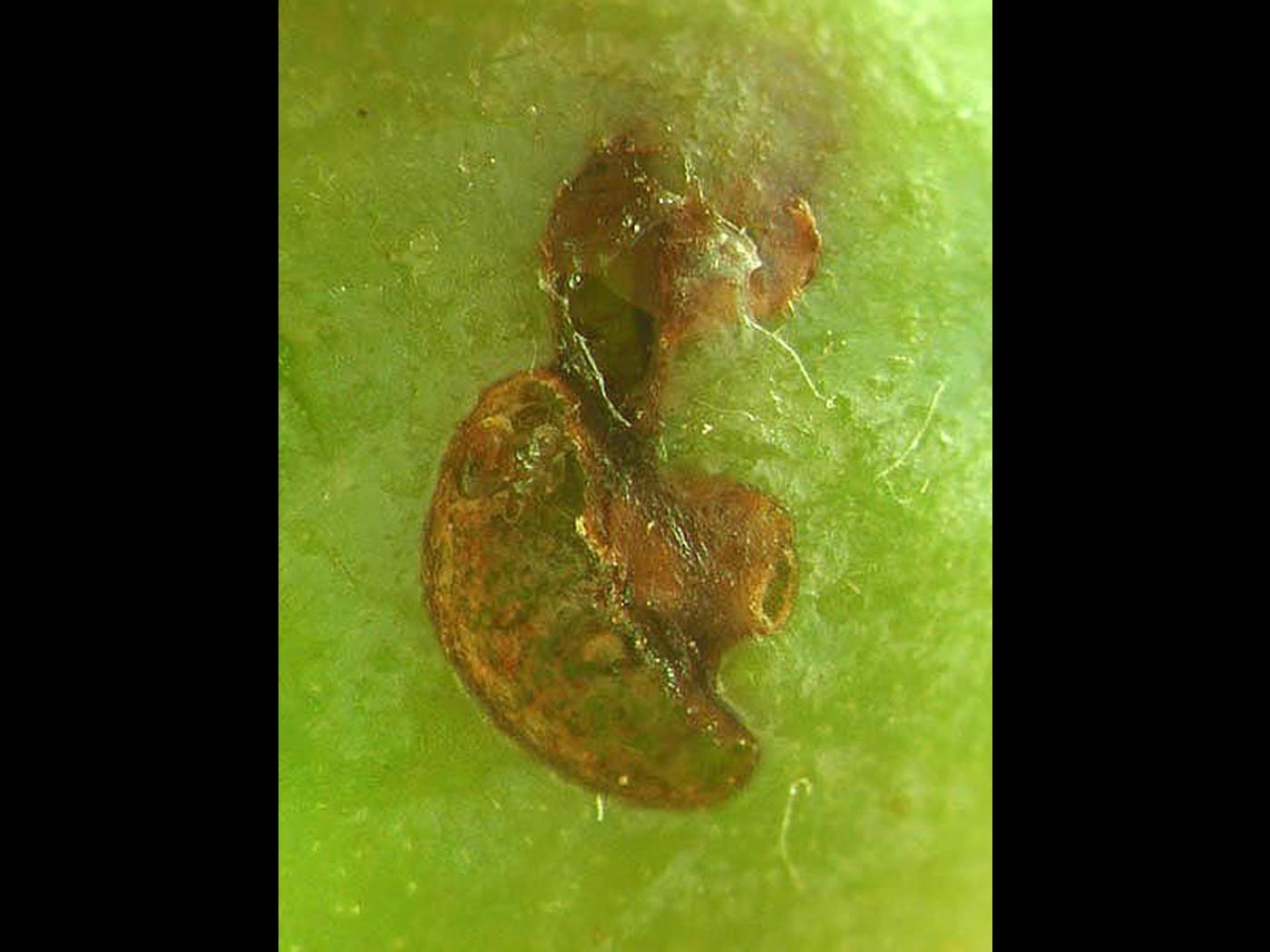 Description: Gros plan sur un bleuet vert présentant une cicatrice de ponte du charançon de la prune : la cicatrice se caractérise par sa forme de croissant. Cette cicatrice est causée par le comportement de la femelle qui perce une ouverture de forme particulière avant de déposer ses oeufs directement dans la chair du fruit.