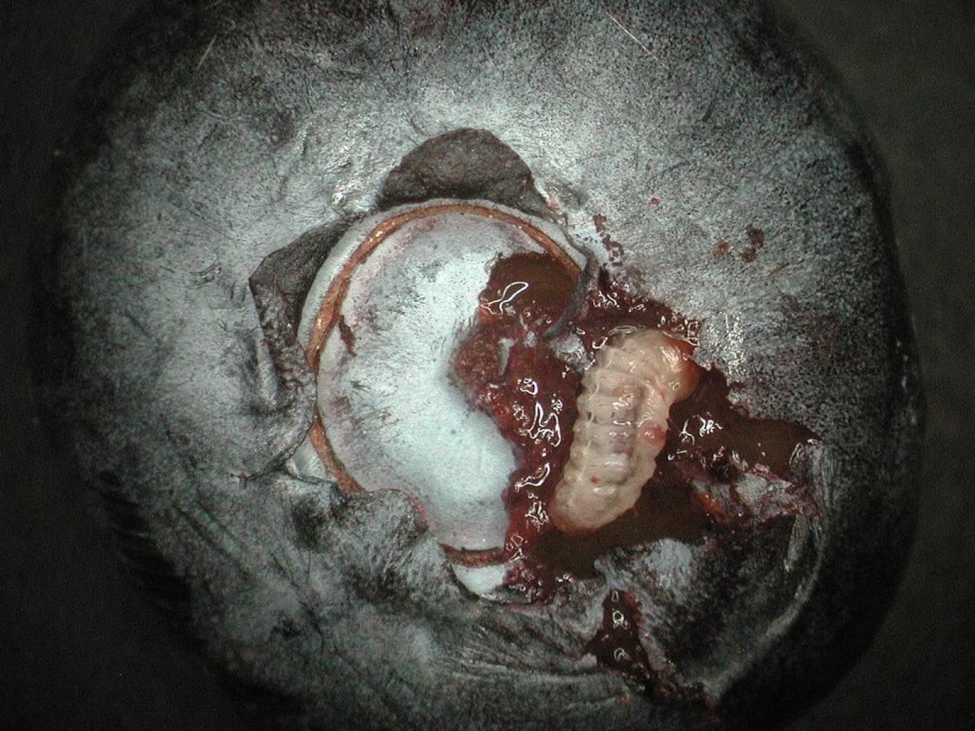 Description: Un bleuet endommagé par une larve de charançon de la prune. La larve creuse une galerie dans la chair du fruit et celui-ci devient prématurément coloré et tombe avant récolte. Souvent, le symptôme est peu visible à l'exception d'une petite cicatrice de ponte à la surface des fruits (surtout sur les fruits verts). Pour observer la larve, le fruit doit être ouvert.