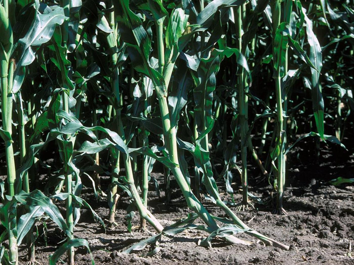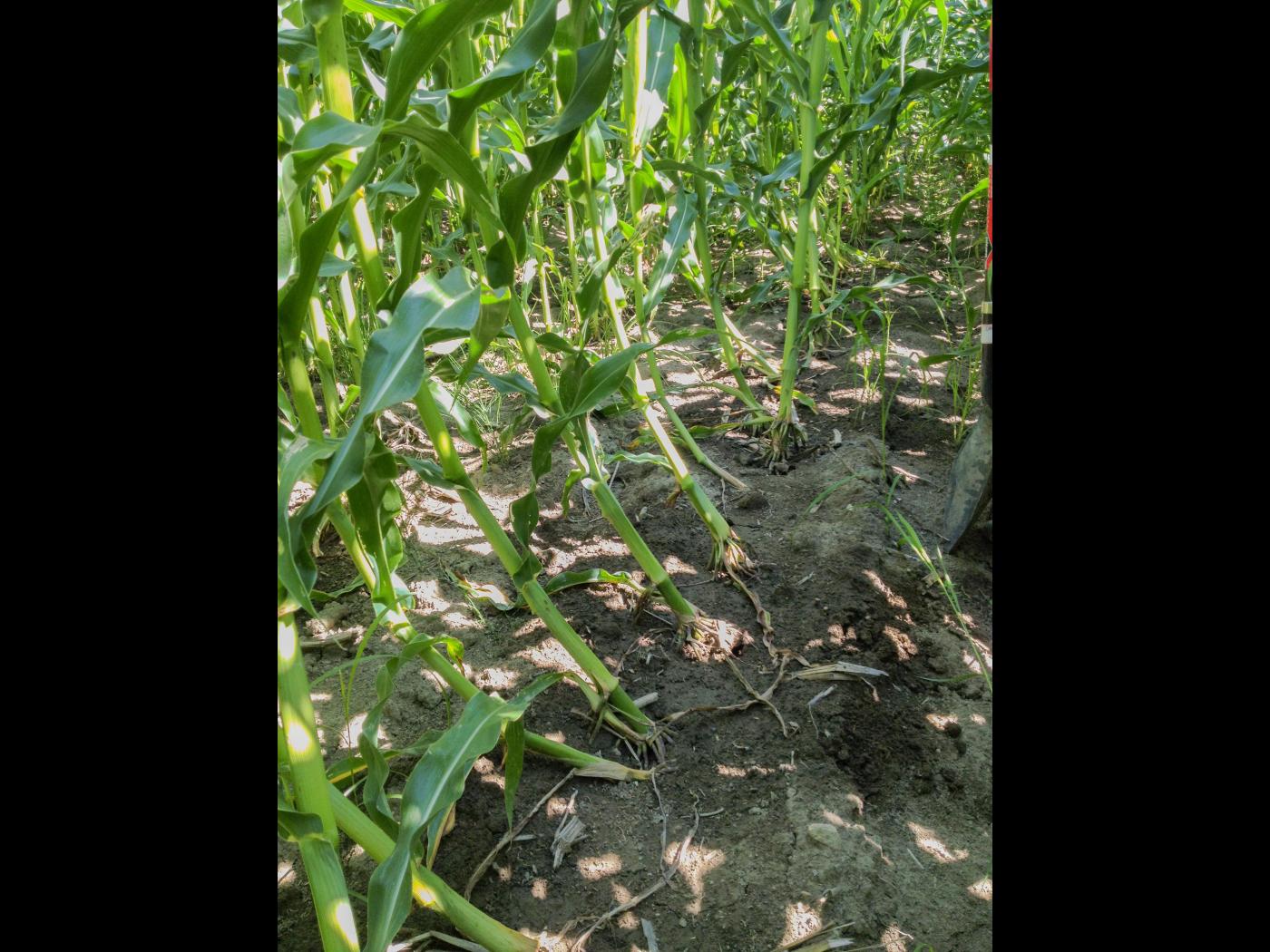 Description: Des plants de maïs avec la tige recourbée en forme de col de cygne, symptôme résultant des dommages causés par des chrysomèles des racines : les larves se nourrissent presque exclusivement de racines de maïs. Les jeunes larves grignotent les radicelles alors que les larves plus âgées creusent des galeries dans les racines d'ancrages. Les plants endommagés sont alors susceptibles de pencher ou de verser. Certains plants prennent alors la forme d'un col de cygne lorsqu'ils se courbent vers le haut…