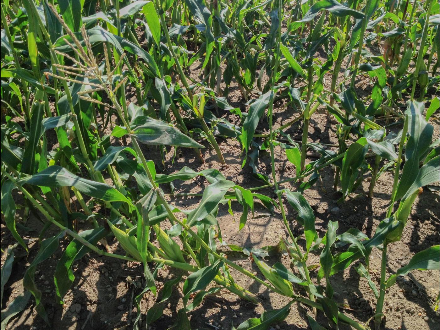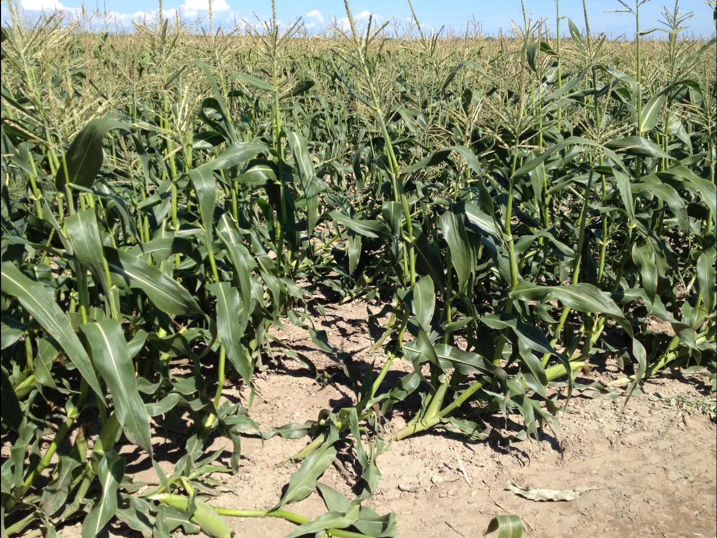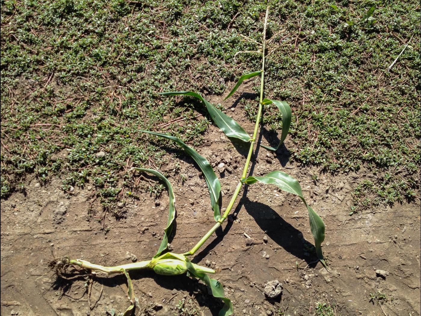 Description: Des plants de maïs avec la tige recourbée en forme de col de cygne, symptôme résultant des dommages causés par des chrysomèles des racines : les larves se nourrissent presque exclusivement de racines de maïs. Les jeunes larves grignotent les radicelles alors que les larves plus âgées creusent des galeries dans les racines d'ancrages. Les plants endommagés sont alors susceptibles de pencher ou de verser. Certains plants prennent alors la forme d'un col de cygne lorsqu'ils se courbent vers le haut… En savoir plus