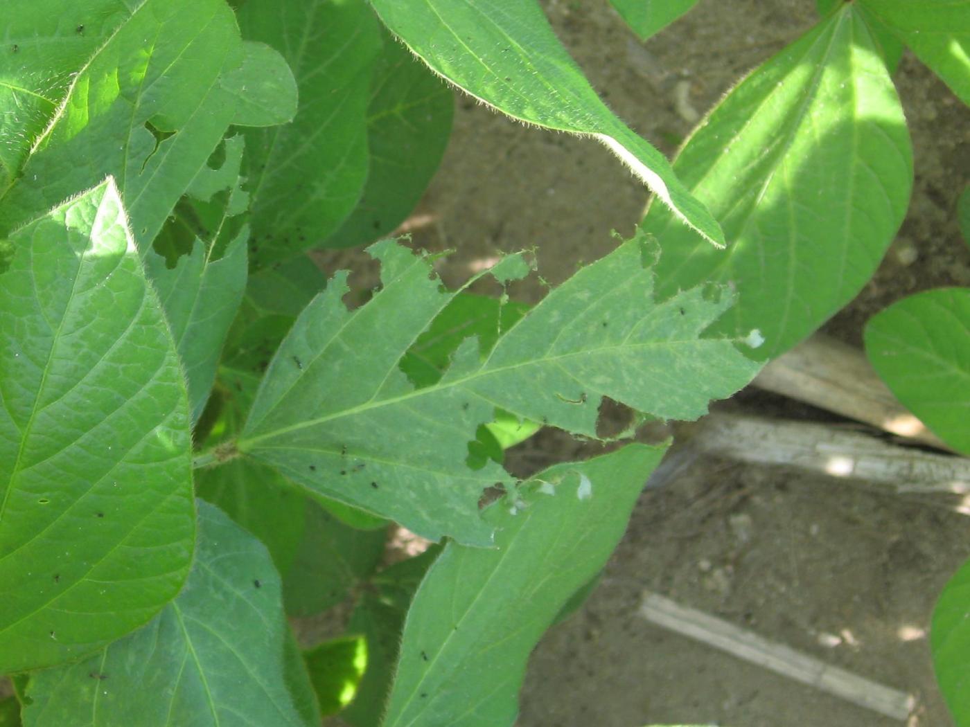 Description: Plants de soya présentant des dommages causés par le méloé cendré : les adultes grignotent en totalité les feuilles à l'exception des nervures principales.