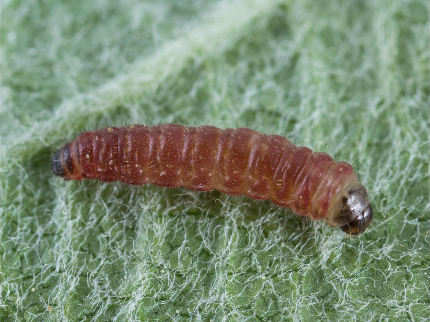 Larve : 8,0 mm à maturité; la tête est noire; le corps est rose brunâtre et est recouvert de petites soies pâles; la plaque anale est foncée.