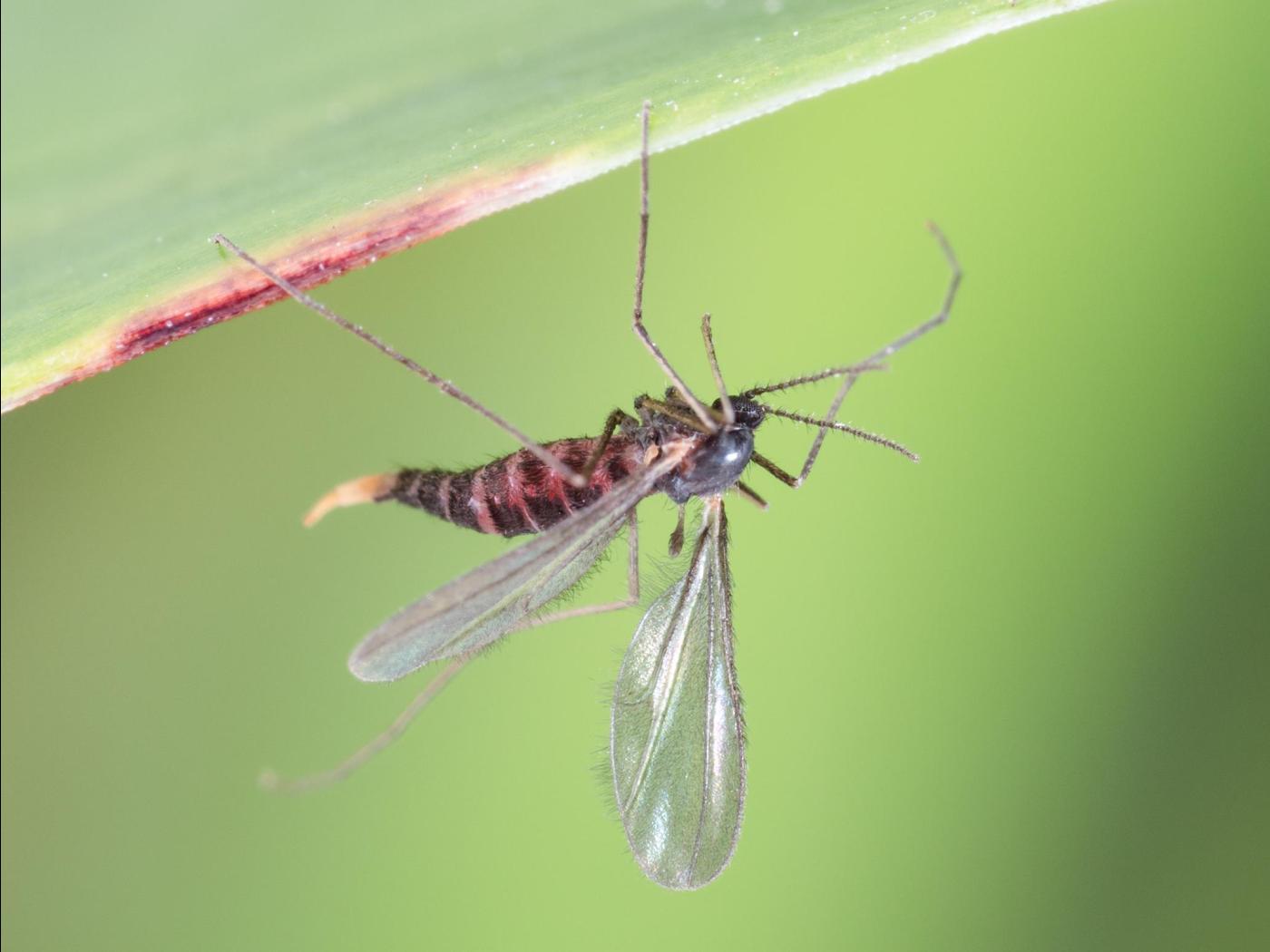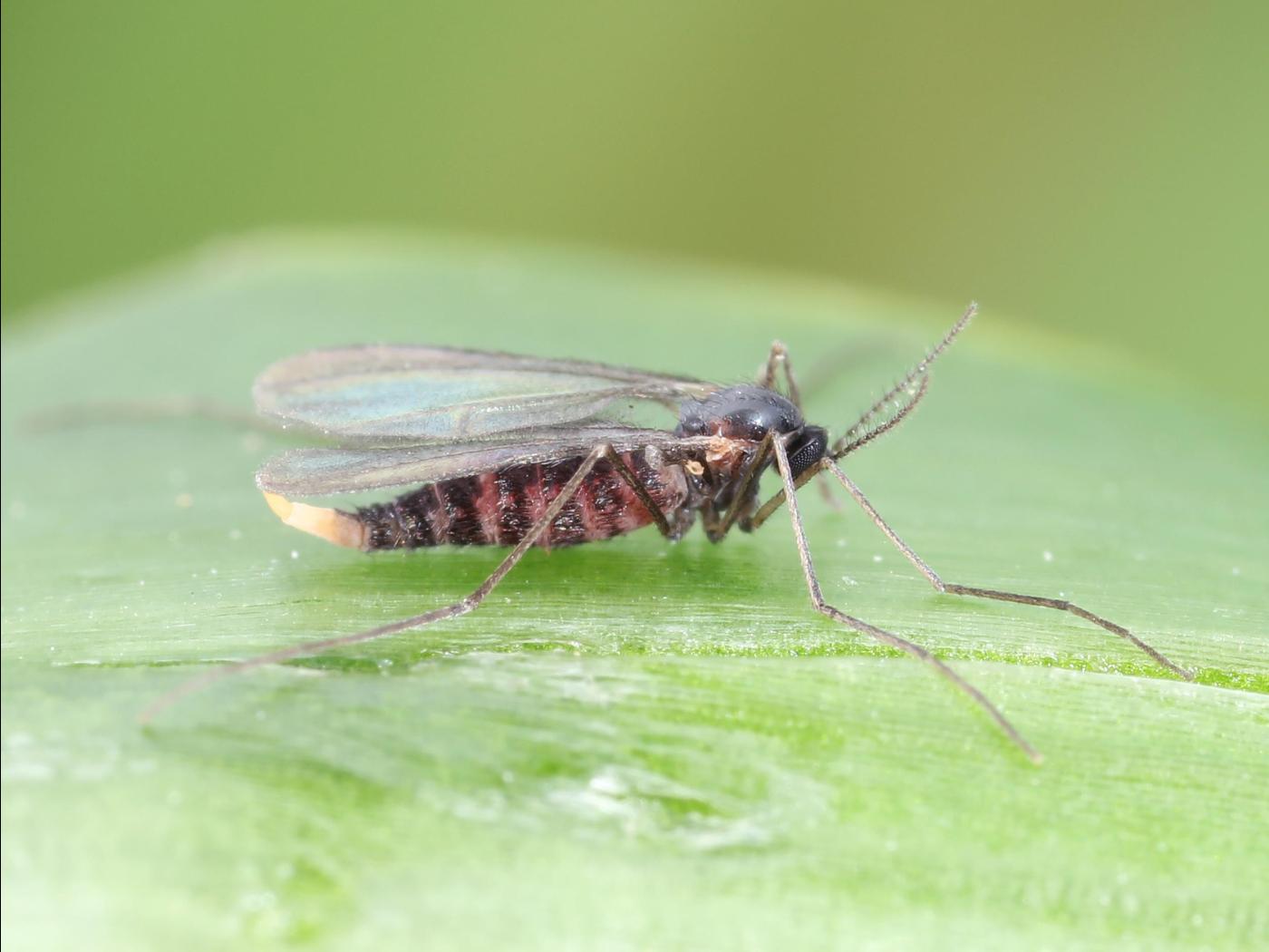 Adulte : 3,0 à 5,0 mm; la forme générale est semblable à celle d’un moustique; les antennes et les pattes sont longues et minces; les ailes sont ovales et transparentes; l’abdomen de la femelle est rougeâtre en raison de la couleur des œufs qu’elle porte; une pubescence noire est présente sur presque tout le corps.