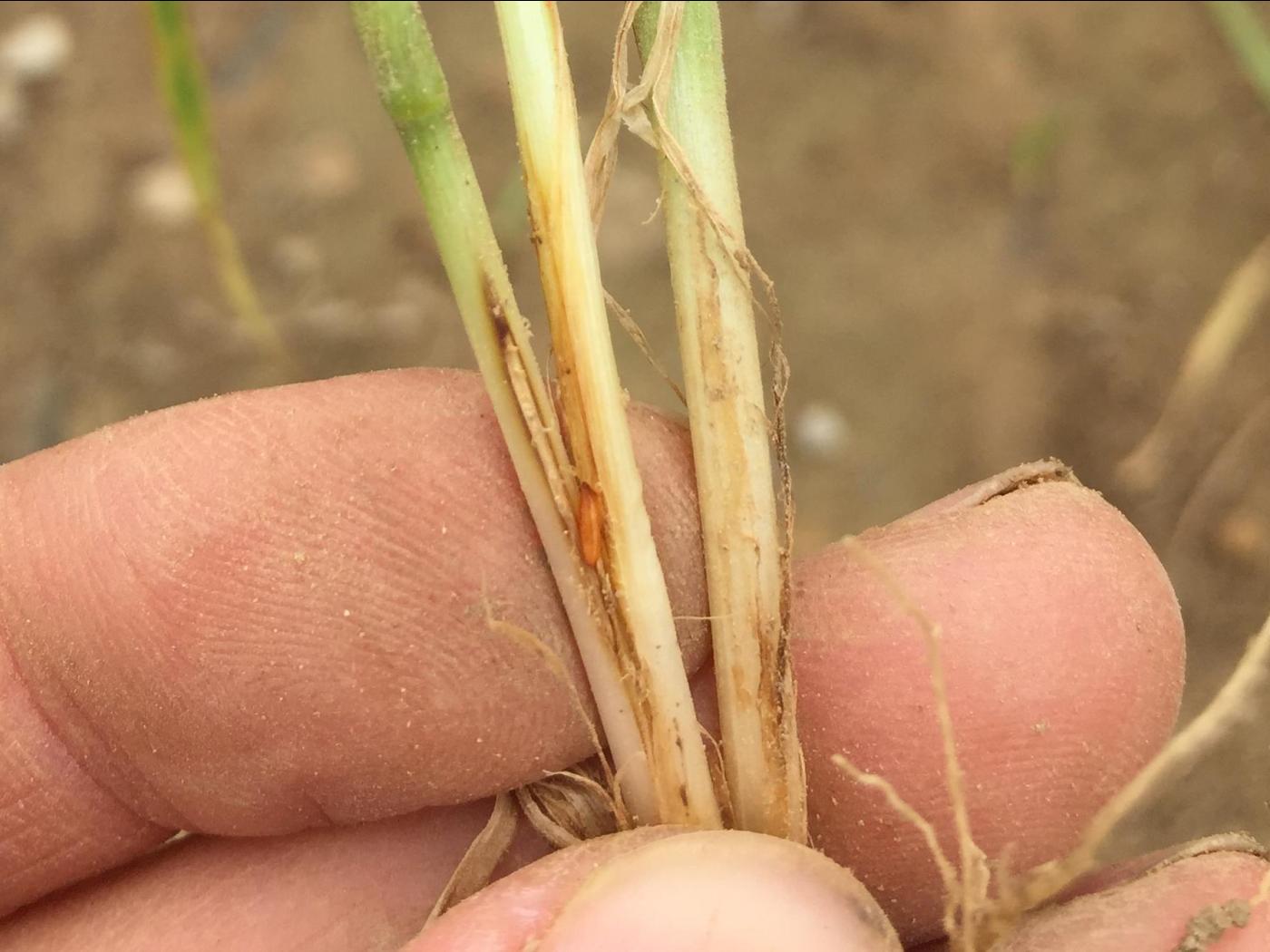 Les tiges infestées ont tendance à jaunir, à flétrir et à se dessécher.