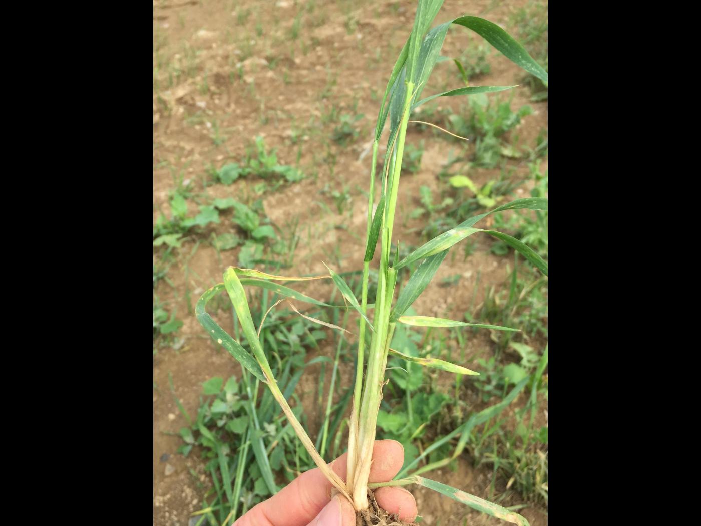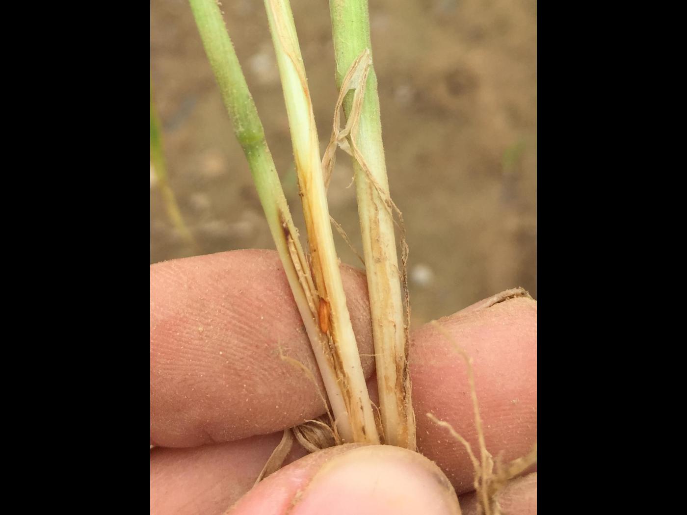 Description: Dommages causés par le développement de la larve d'Oscinella pusilla sur une tige de blé de printemps. On observe le fendillement longitudinal à la base de la tige ainsi que la présence de la pupe d'O. pusilla. Les tiges attaquées se dessèchent et ne sont pas en mesure de produire des épis.