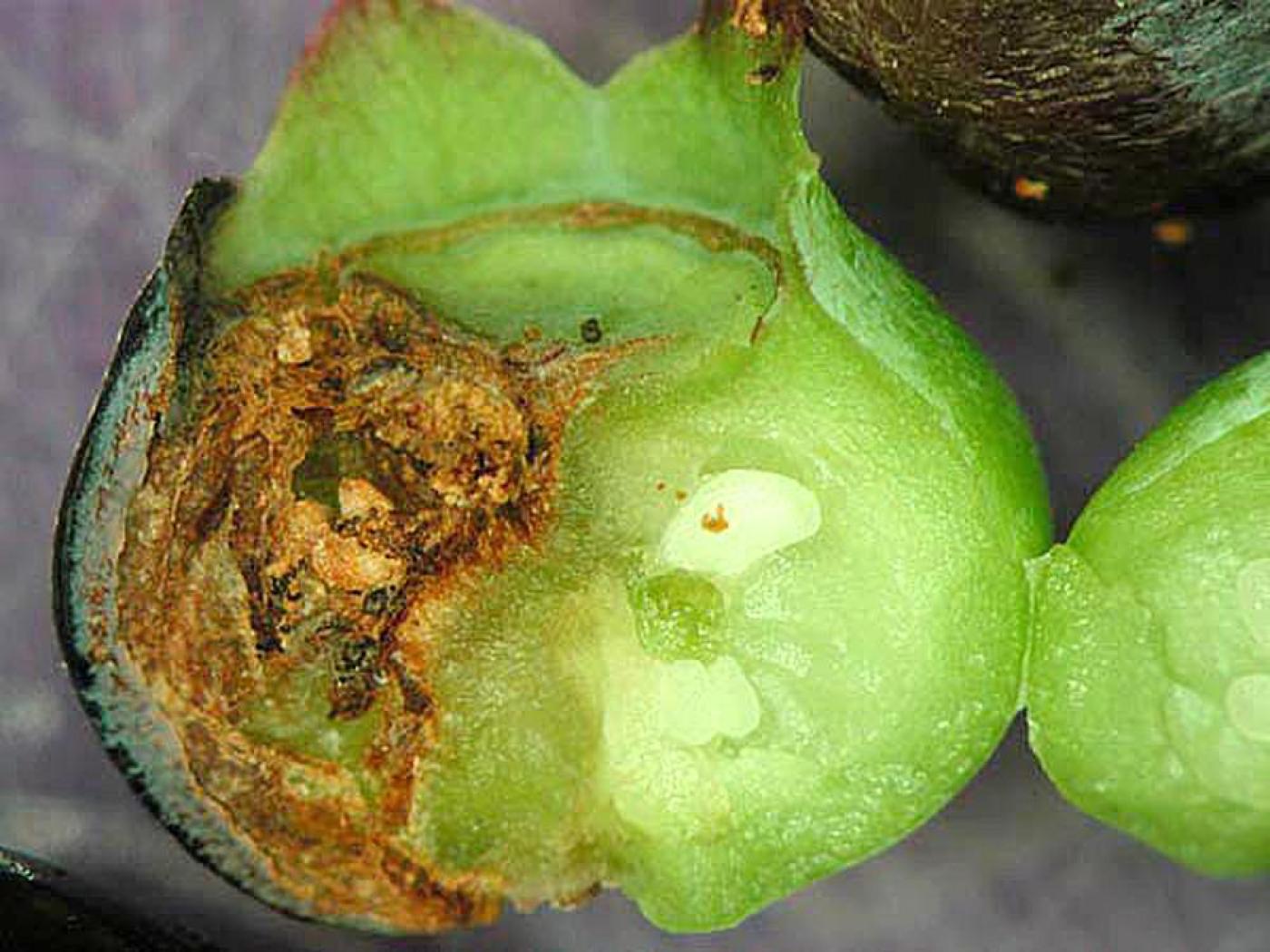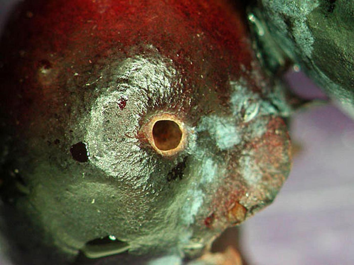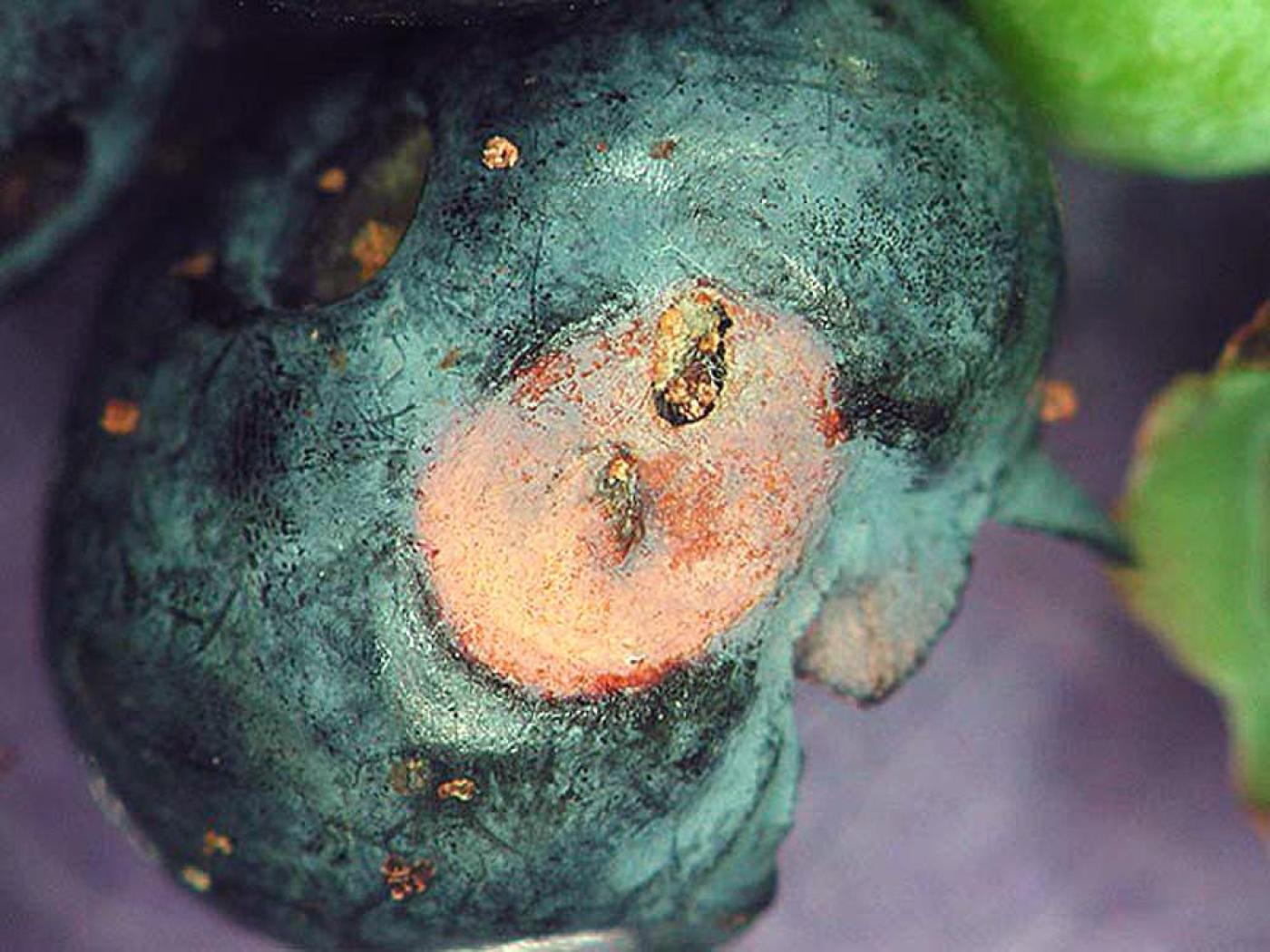 Description: Gros plan d'un bleuet présentant un trou causé par la larve de la pyrale des atocas. La femelle pond ses oeufs individuellement sous les lobes du fruit. La jeune larve perce un trou, pénètre dans le fruit et ferme le trou avec de la soie. Plus âgée, elle laisse le trou béant, y rejetant souvent des excréments. Les larves se développent principalement dans les fruits verts et s'alimentent presque de la totalité du fruit. Les fruits attaqués mûrissent prématurément. Une larve peut consommer de tro…