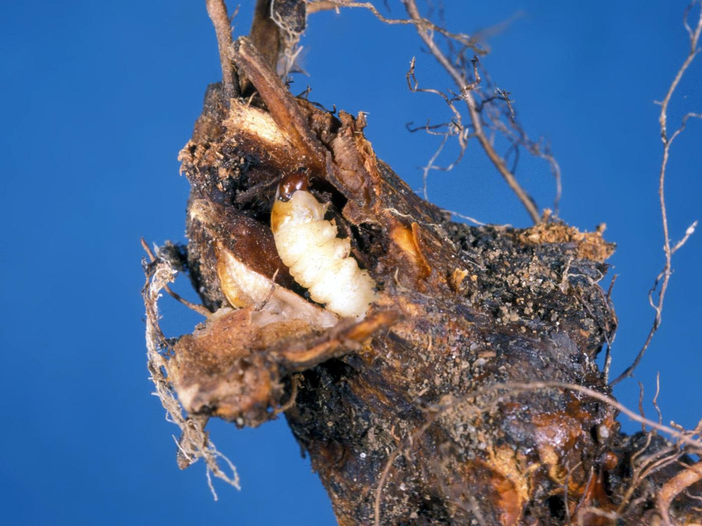 Larve : 25,0 à 33,0 mm à maturité; la tête est brune et aplatie dorso-ventralement; le corps est de couleur blanc crème; les fausses-pattes sont très courtes; les crochets des fausses pattes sont disposés transversalement en forme d'ellipse.