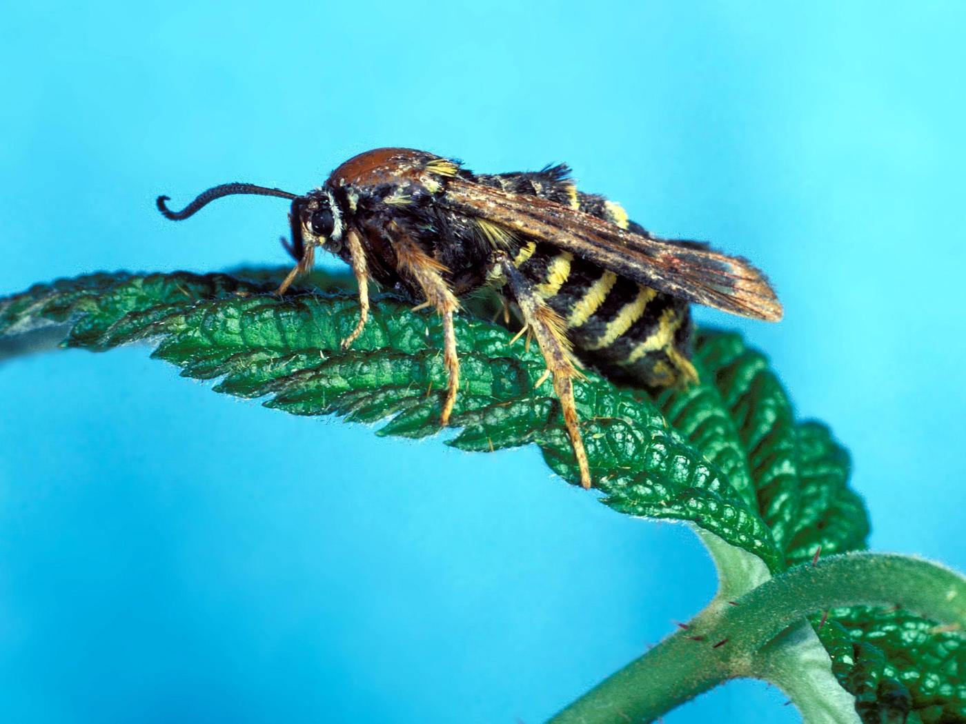 Ce papillon ressemble à une guêpe avec son corps noir rayé jaune et ses ailes membraneuses. Contrairement aux guêpes, il est cependant incapable de piquer.