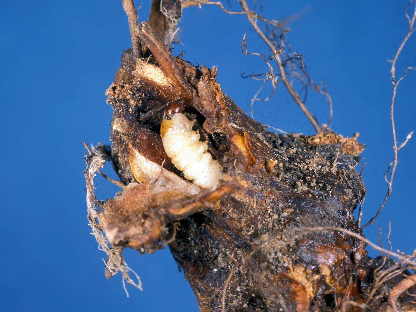 Description: Coupe du collet d'un plant de framboisiers présentant une larve de rhizophage du framboisier dans sa galerie. Le cycle vital de cette espèce est de deux ans. La première année, les jeunes larves s'abritent sous l'écorce niveau du collet de la plante. L'année suivante, les larves migrent plus profondément en creusant des galeries au niveau du collet, des racines et des tiges ce qui induit la formation d'un renflement à la base du plant. Le feuillage des tiges infestées se dessèche et la tige cass… En savoir plus