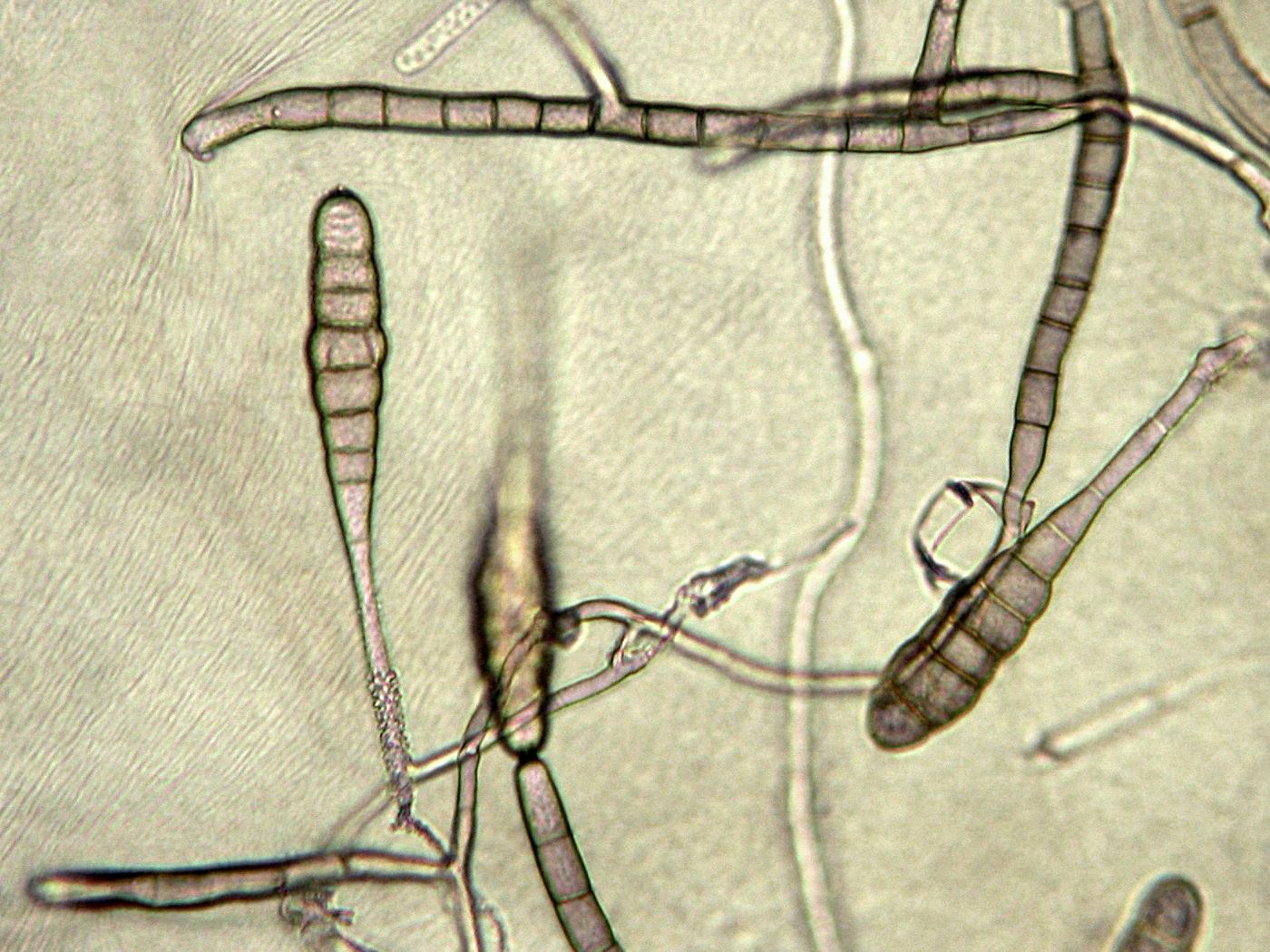 - Conidies : Conidies obclavées (= en forme de massue inversée). Dictyospores (8-12 septations transversales et 0-7 septations longitudinales ou obliques). Long rustrum pouvant être ramifié. Solitaires (pas en chaîne). Brun pâle à brun foncé. Dimension : 100-300 x 15-20 µm.