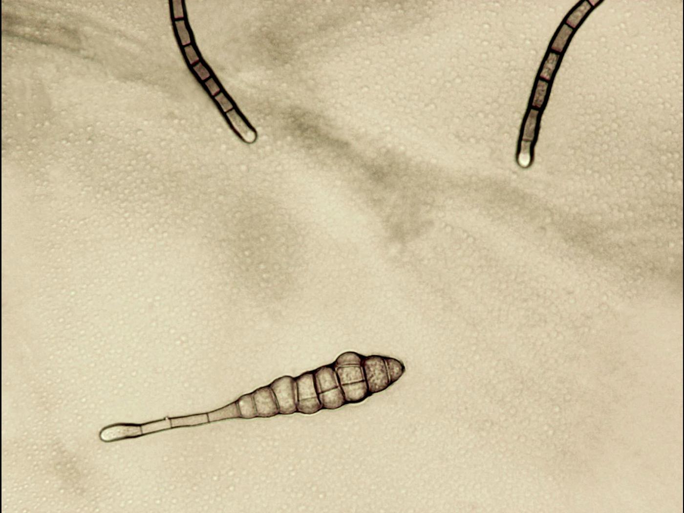 Légende: Conidies, conidiophores et hyphe d'Alternaria tagetica