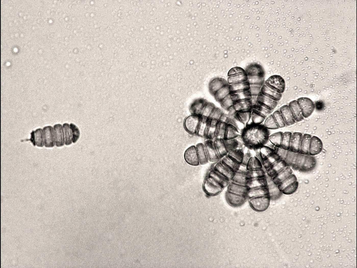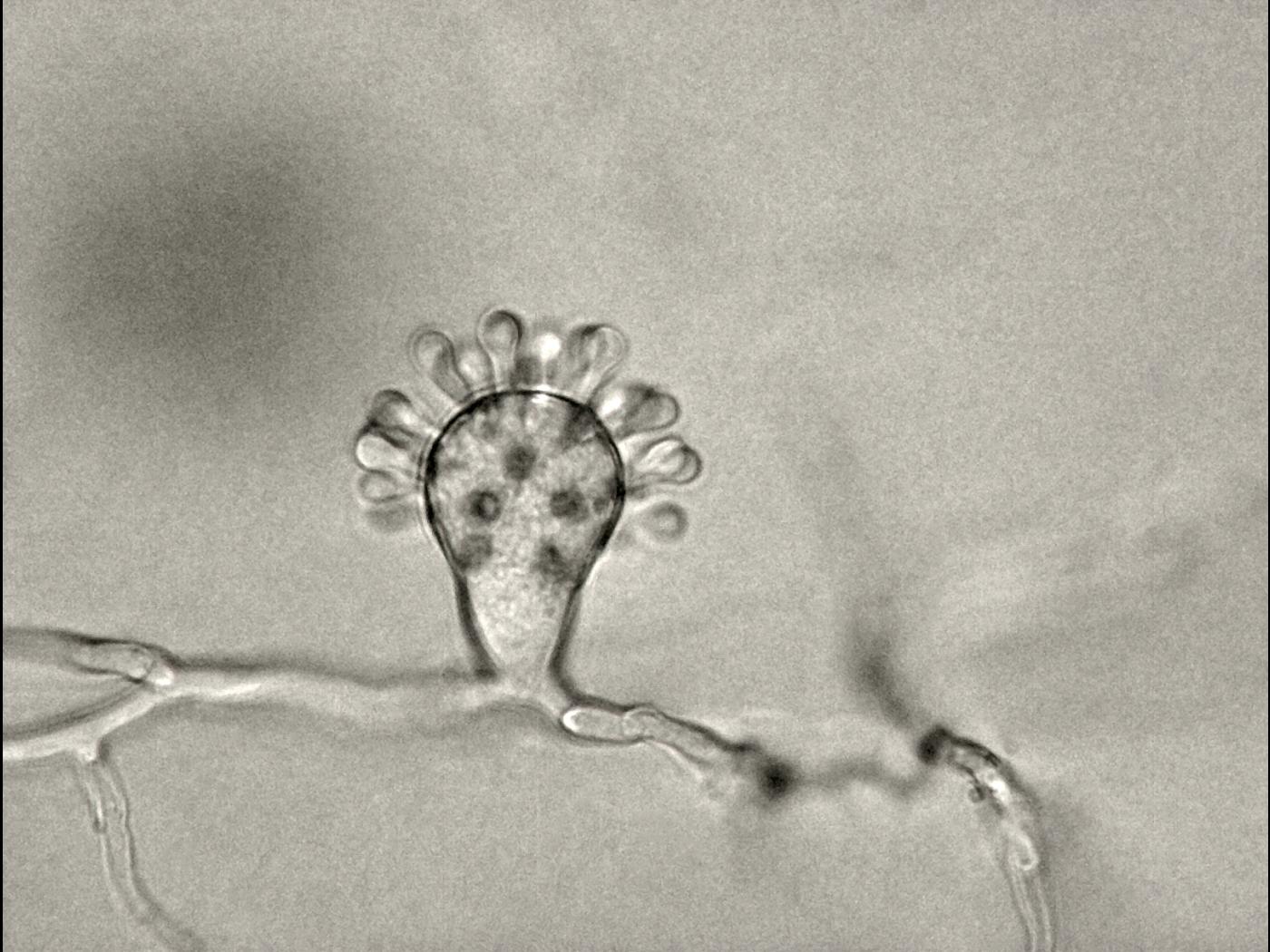 - Cellules coniodiogènes : Terminales (= localisées à l'extrémité du conidiophore), claviformes (= en forme de massue) ou subsphériques, portant jusqu'à 3 conidies matures et des dizaines de conidies immatures plus petites (elles forment des ballons à la surface de la cellule conidiogène). Dimension : 19-29 x 16-20 µm.