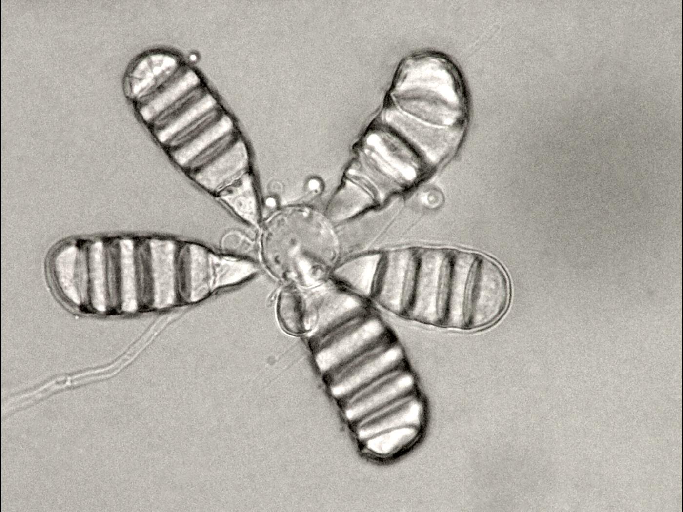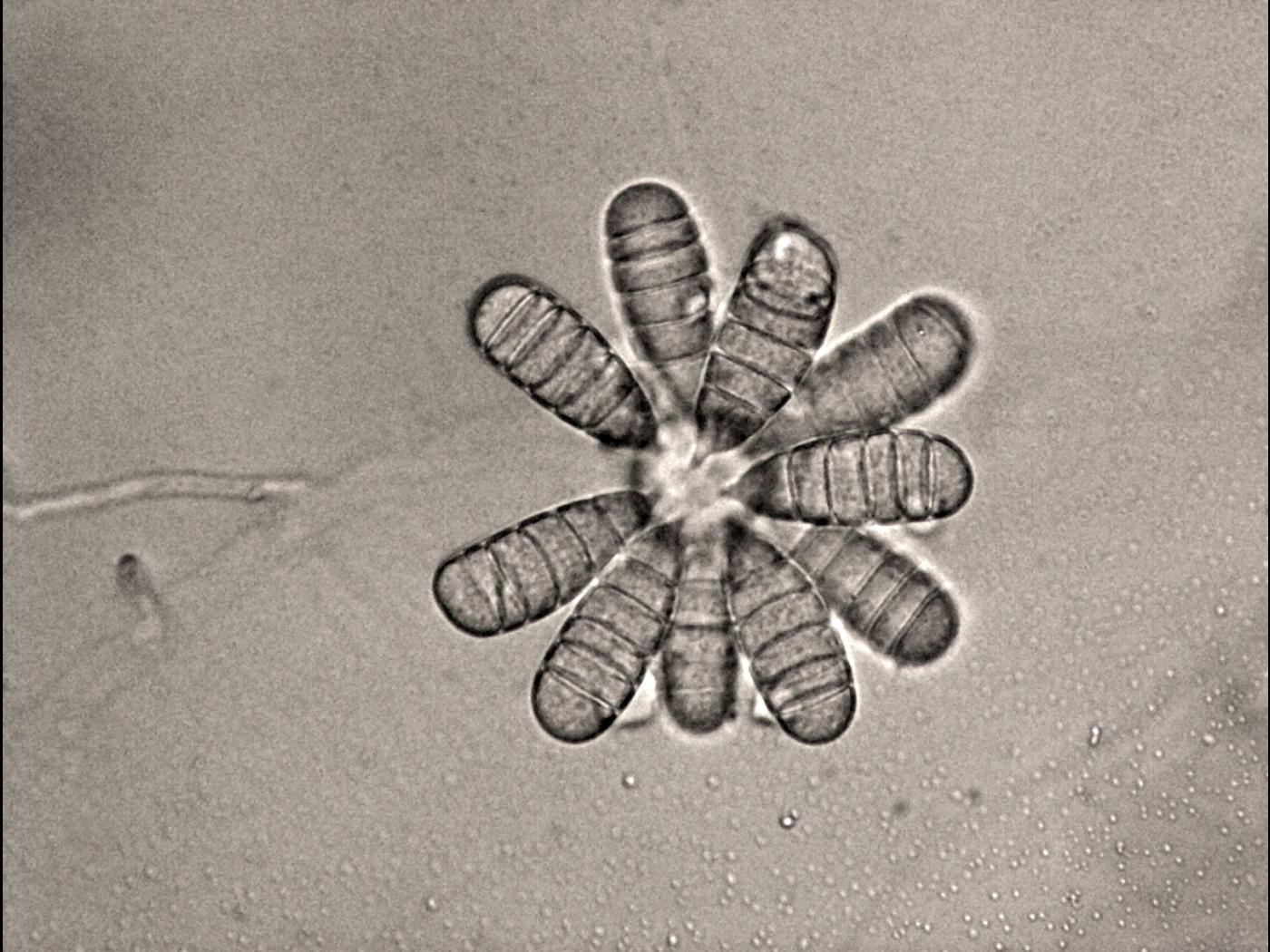 - Conidies : Seules, ayant de 2-3 septations, de forme cylindrique à légèrement clavée, pointues en sa base et de couleur brun pâle. Dimension : 18-24 x 24-37 µm.
