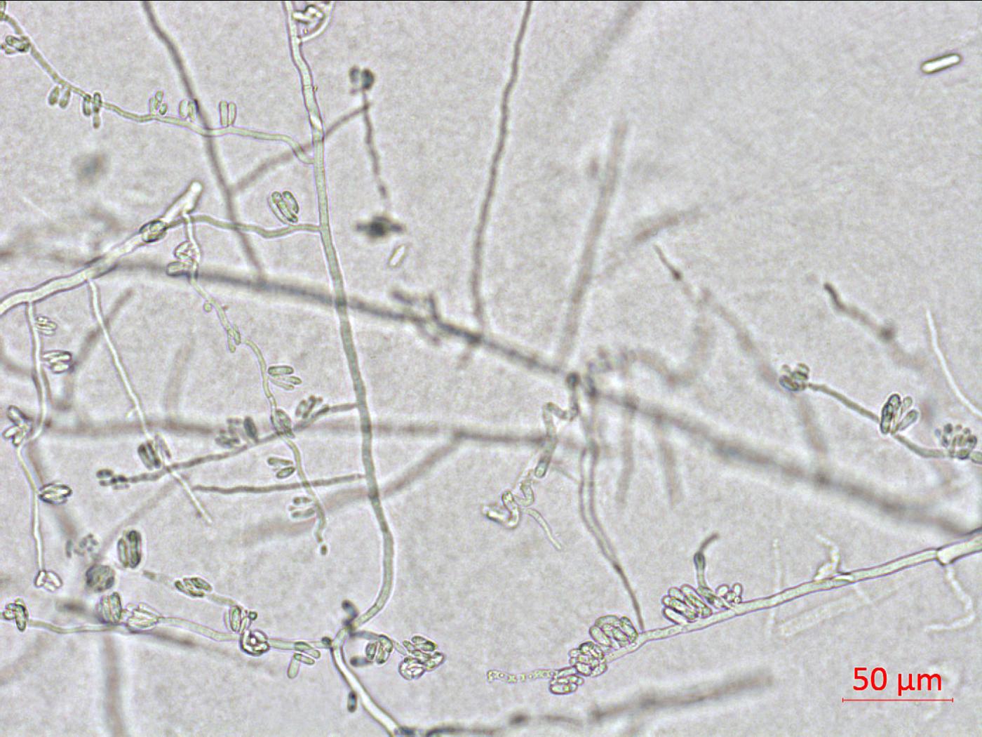- Microsclérotes : Abondants sur milieu de culture et sur la plante hôte. Grisâtres (= jeunes sclérotes) / noirs avec des setae bruns (= sclérotes matures). Les microsclérotes peuvent se transformer en acervules. Diamètre : 110-160 µm.