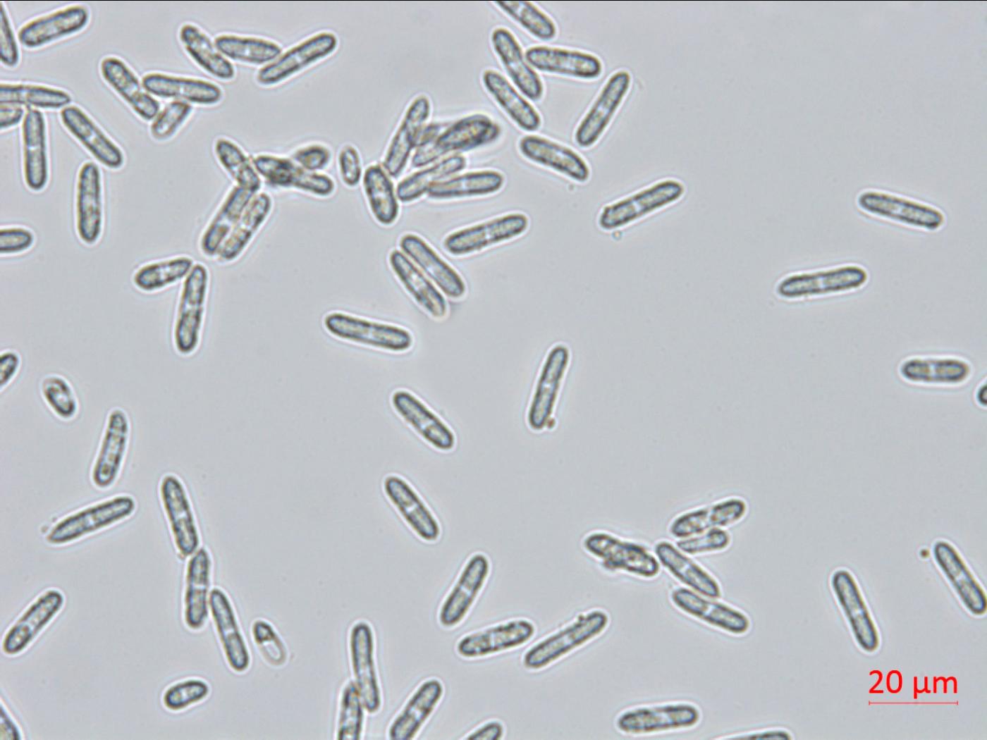 - Conidies : Cylindriques à fusiformes. Hyalines. Sans septation (= amérospores). Petites guttules souvent localisées aux extrémités. Lorsque regroupées en masse (exsudat conidien), les conidies ont une teinte hyaline à orange saumon. Dimension : 16-24 x 2,5-4,5 µm.