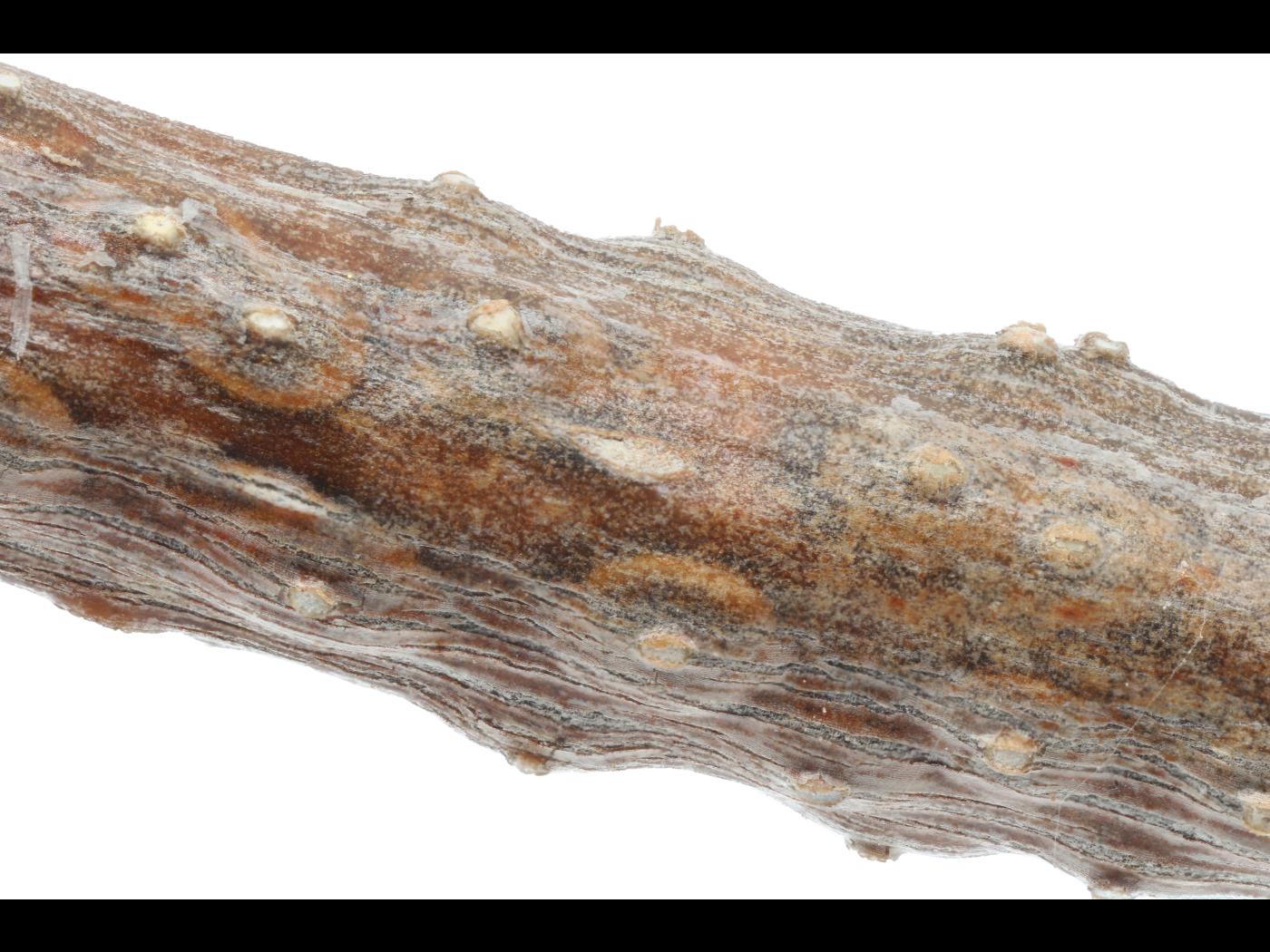 Légende: Pycnides de Cytospora chrysosperma sous l'épiderme d'une branche de peuplier faux-tremble