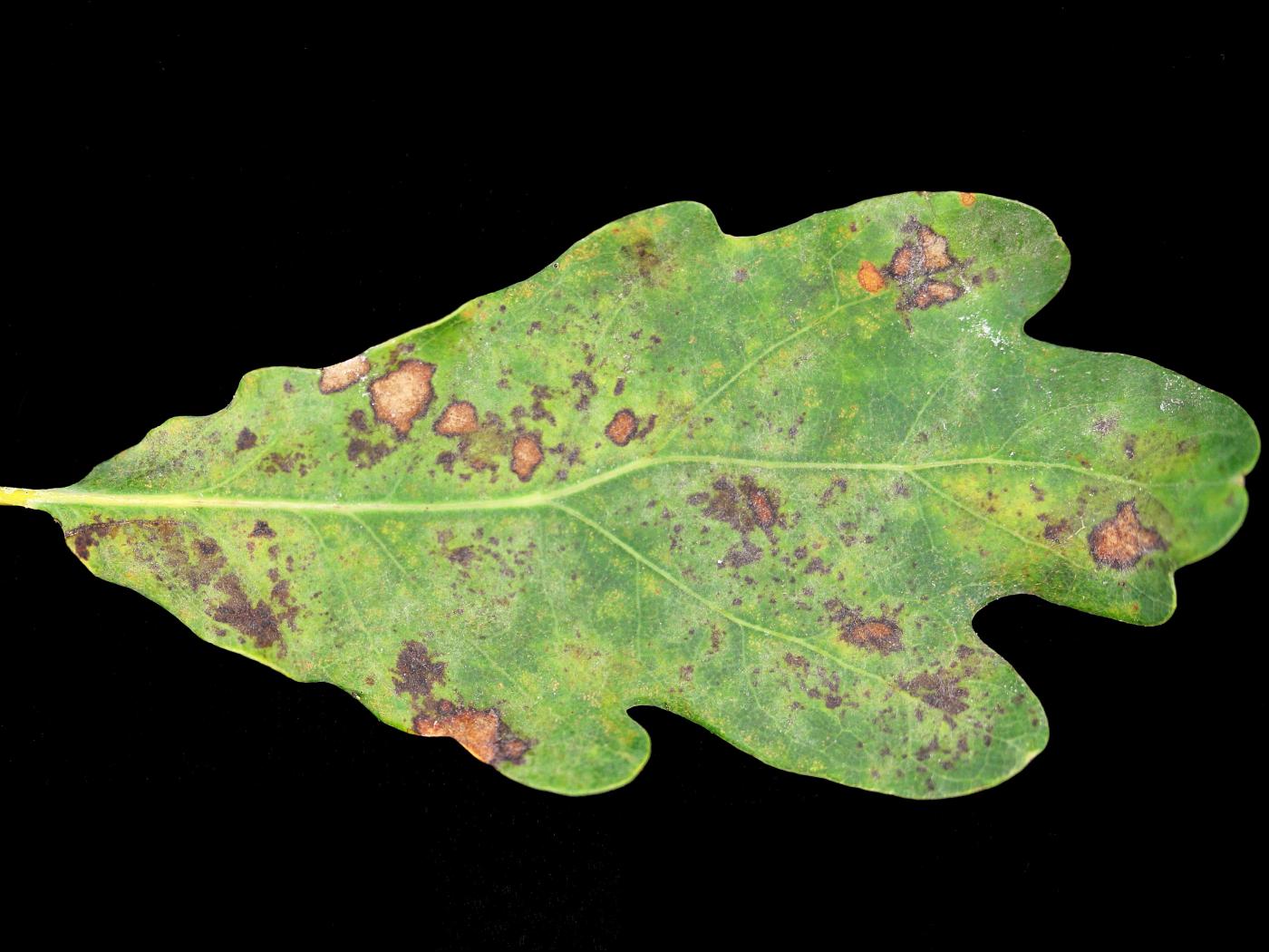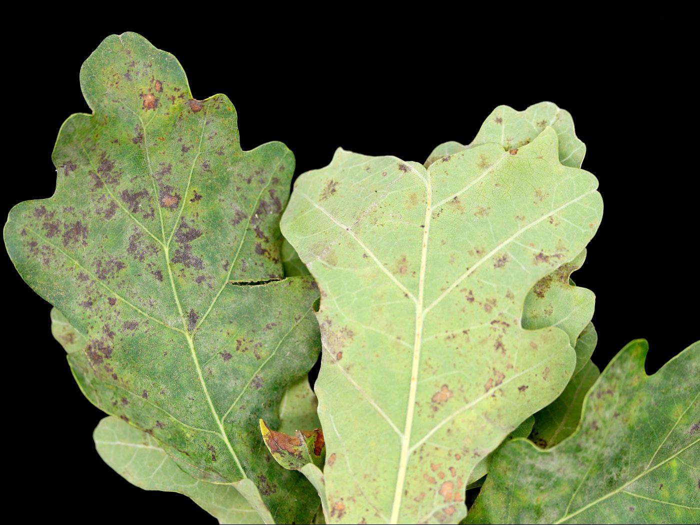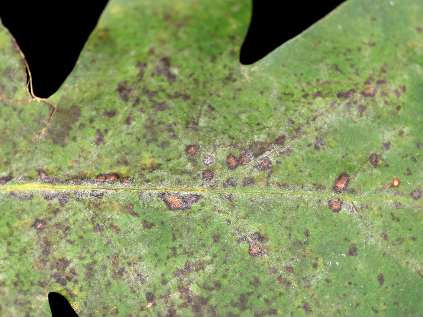 Feuille : présence d’un duvet blanc de mycélium observé à la face supérieure et inférieure. Le mycélium couvre parfois presque toute la surface foliaire. Occasionnellement, présence d’un jaunissement à brunissement du limbe, de taches ou de nécroses brunes à noires. Le blanc peut causer une défoliation précoce.