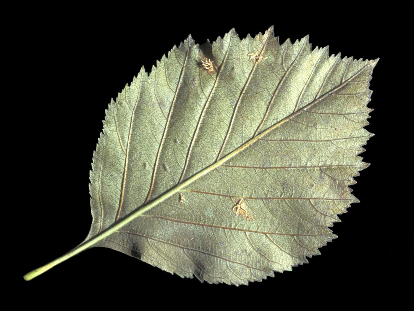 Légende: Fructifications fongiques sur feuille d'aubépine