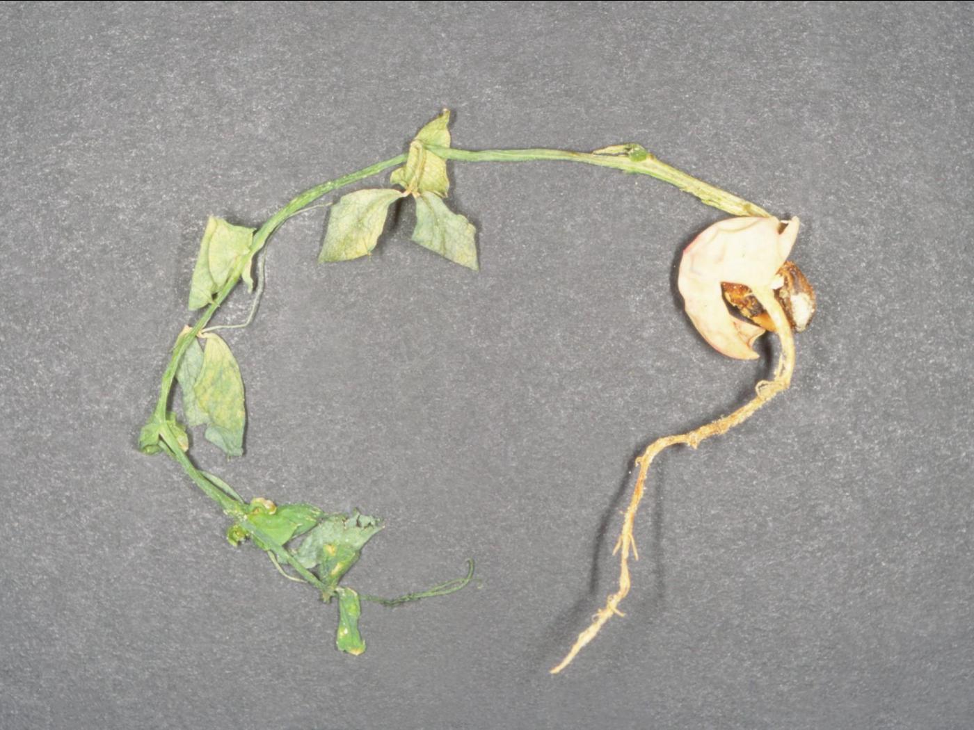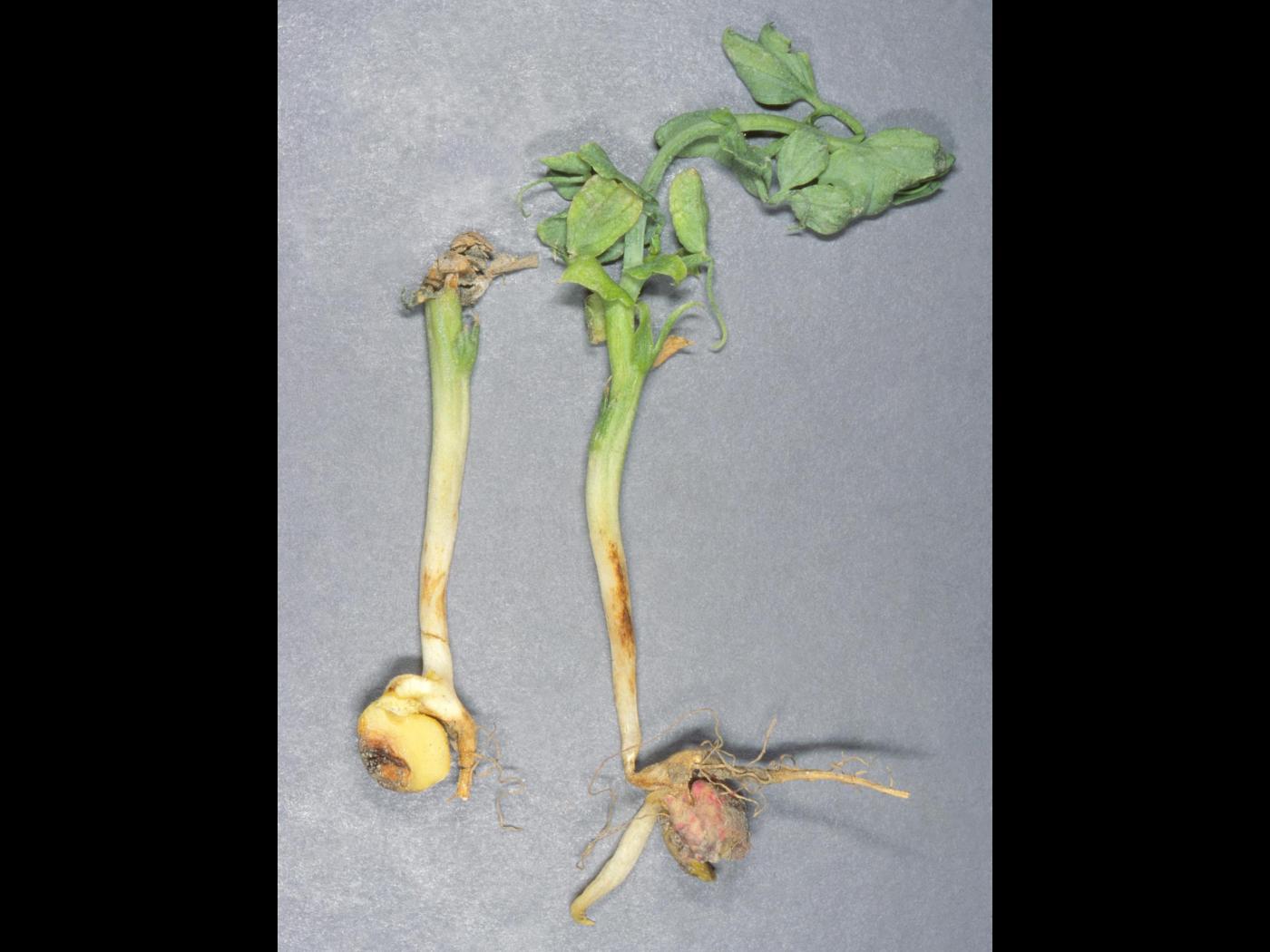 Plantule : le champignon infecte d’abord la zone de fixation des cotylédons puis l’épicotyle souterrain, l’hypocotyle et la partie supérieure de la racine pivot. L’infection s’étend ensuite vers le haut jusqu’à la ligne de sol ou vers le système racinaire. La racine pivot et les racines secondaires portent des lésions brun rougeâtre à brun noirâtre qui se regrouper en cours de saison pour former une longue lésion noirâtre. Les racines secondaires sont habituellement les plus affectées et sont moins nombreuses. Généralement, le cortex racinaire s’enlève facilement et révèle un système vasculaire habituellement sain. Les feuilles sont faiblement développées et jaunes. Des nécroses peuvent se développer sur les feuilles basales. Les dommages débutent sur les feuilles basales puis progressent vers les jeunes feuilles. Les plantules sont parfois rabougries et leur maturité est précoce.