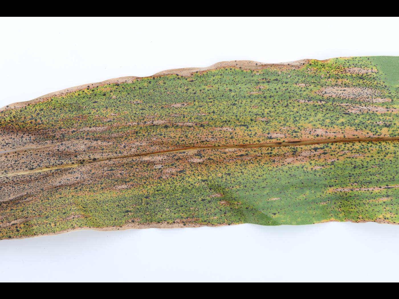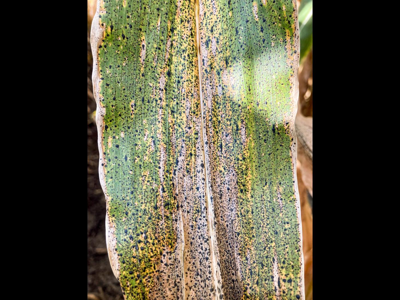 Feuilles : La tache goudronneuse se caractérise par des taches (lésions) noires, surélevées et incrustées dans les tissus des feuilles du maïs. Lorsqu'on les grattent, elles restent collées sur la feuille. Ces lésions sont rondes ou de forme allongée allant de 2 à 5 mm environ. Dans certains cas, elles sont entourées d’un halo beige ou brun.