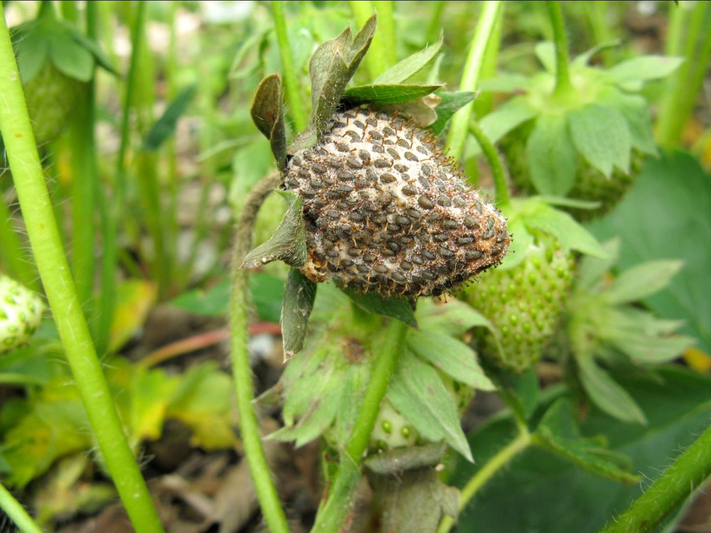 Phytophthora cactorum est un oomycète (règne des Chromistes) affectant une grande gamme d’hôtes comprenant, entre autres (pommier, poirier, cerisier, noisetier, rhododendron, azalée, fraisier, etc.). Chez le fraisier, P. cactorum affecte les fruits et le collet. Sur le fruit, la maladie prend l’appellation de pourriture cuir ou amère tandis qu’au collet, on parle du cœur rouge du rhizome ou de la pourriture des racines et du collet. Ces deux maladies ne se manifestent pas en même temps dans la fraisière. La pourriture cuir est spécifique à la fraise et se distingue par son odeur nauséabonde et le mauvais goût des fruits. Les producteurs ont généralement une faible tolérance pour la pourriture cuir lors de l’autocueillette. Cette maladie est occasionnelle mais sévère. La maladie évolue rapidement et peut causer des pertes économiques importantes, particulièrement lors de conditions humides. Les fruits atteints sont généralement localisés en bordure du rang étant plus facilement contaminés par les éclaboussures d’eau et de sol. Les fruits en contact avec le sol sont vulnérables.