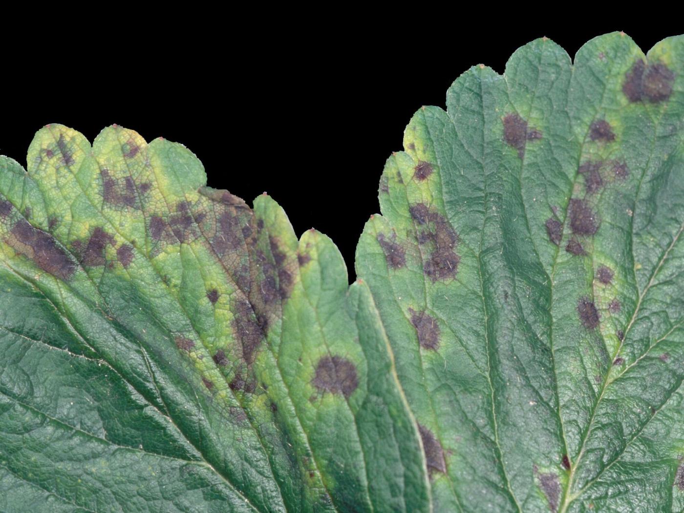 Description: À la face supérieure des folioles de fraisier (cv 'Seascape'), présence de taches circulaires à irrégulières, pourpres foncées à brunes et bordées d’un halo jaune. Les observations microscopiques ont confirmé la présence du champignon Sphaerotheca macularis, responsable du blanc du fraisier.