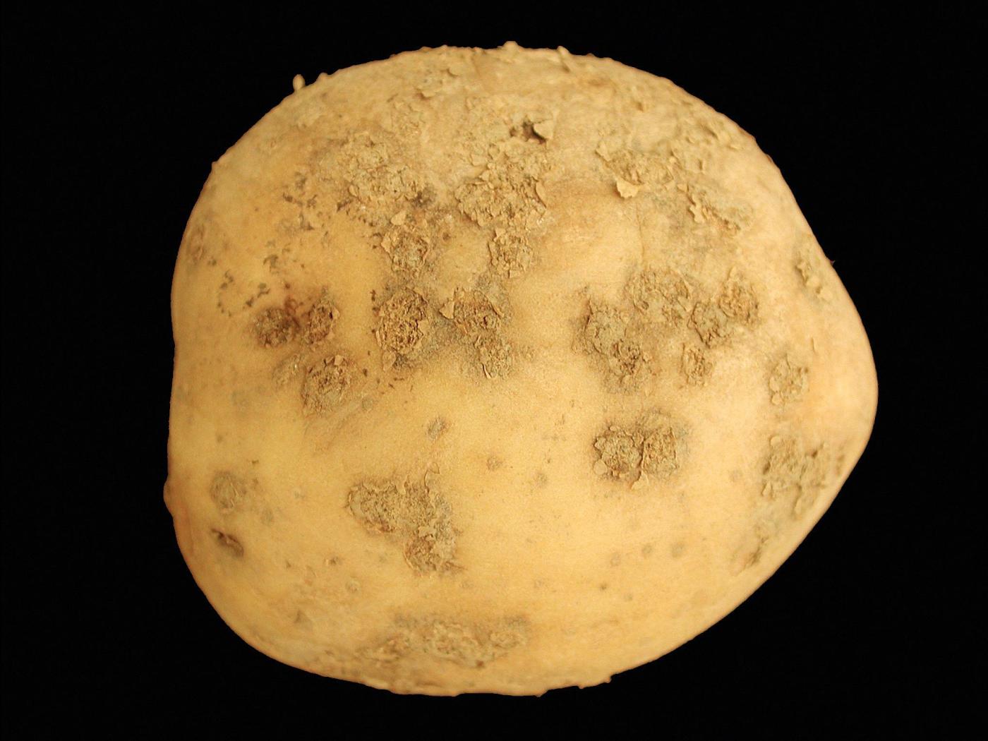 Tubercule : sur les jeunes tubercules, présence de petites lésions gonflées, rondes et jaune pâle. Ces lésions deviennent creuses et brun pourpre. En vieillissant, les lésions sont brun foncé avec une marge saillante et irrégulière. Elles ressemblent à des lésions galeuses et verruqueuses. À maturité, les lésions se brisent et prennent un aspect déchiré. Les gales sont généralement superficielles sauf si le sol est détrempé. L’aspect brun des gales est causé par la présence de masses poudreuses de spores brun foncé (appelée cystosores) dans les gales.