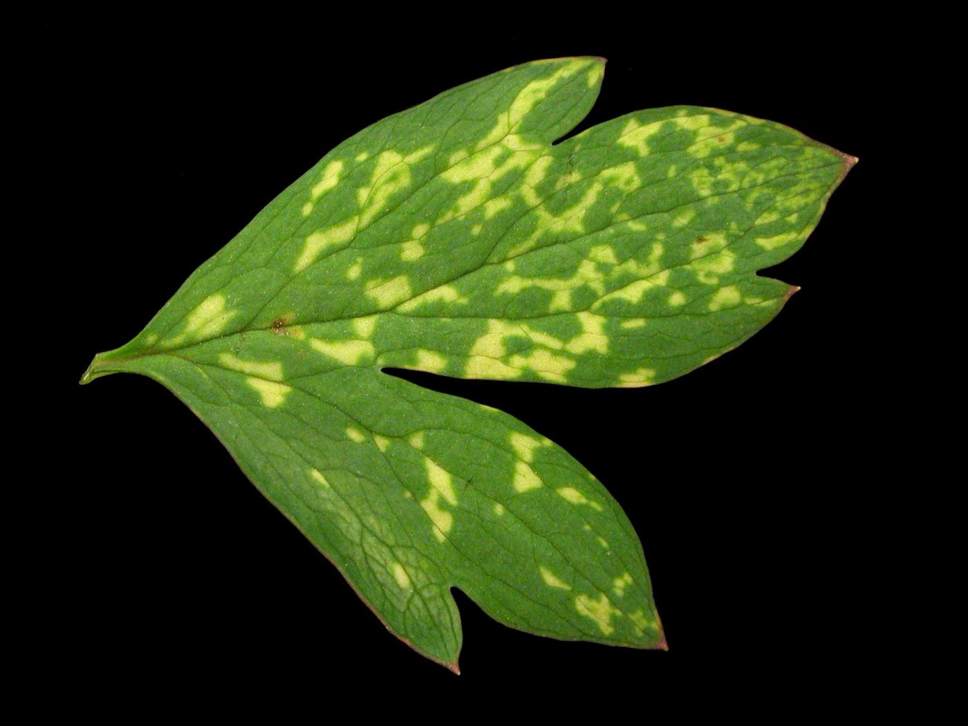 Feuille : présence d’anomalies de coloration variées (jaunissement, rougissement, noircissement) qui se manifestent sous la forme de motif de « feuille de chêne », de mouchetures, de taches en anneaux, de stries ou de lignes. Des déformations et des nécroses sont parfois observées.