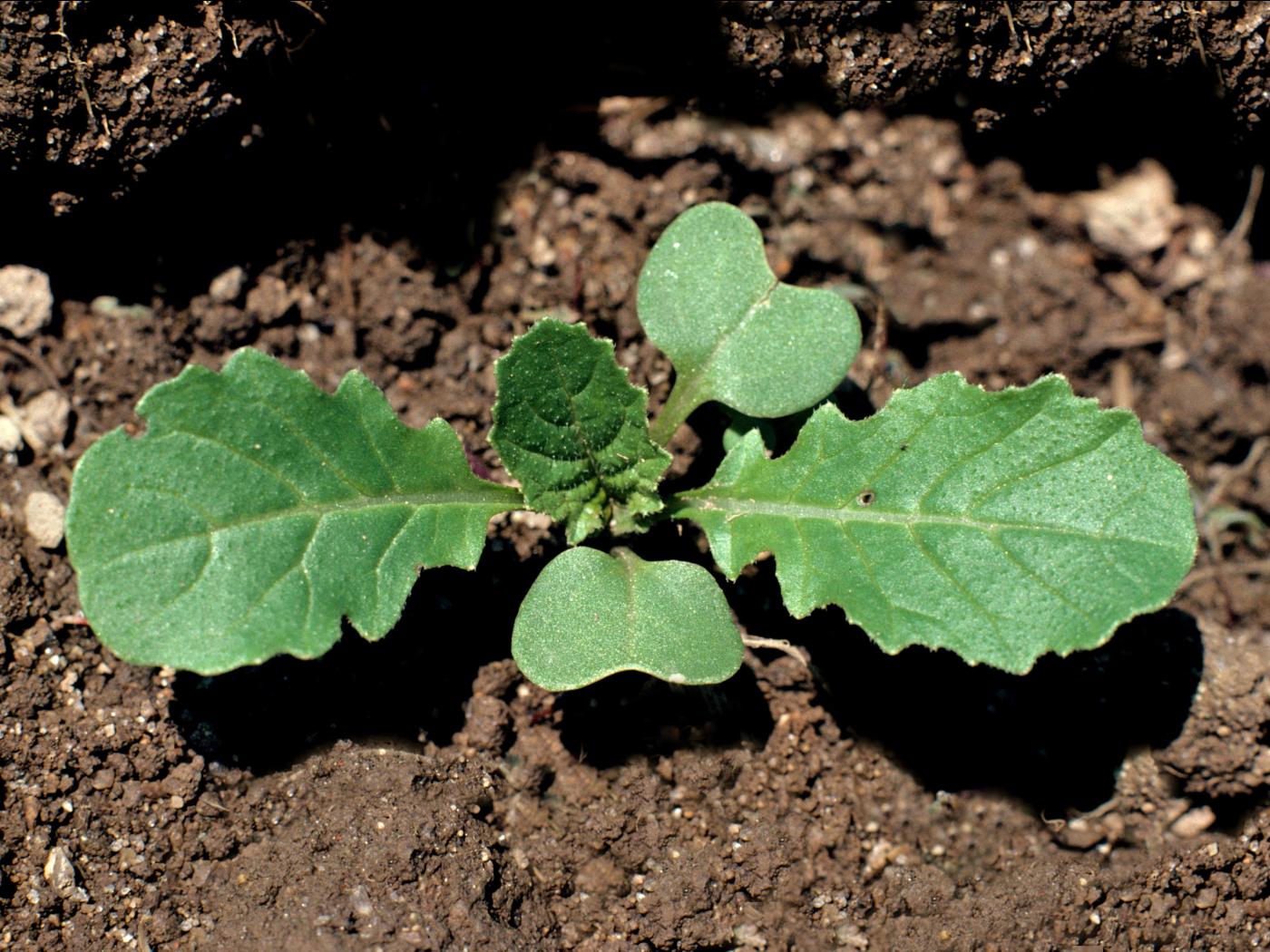 La plantule est composée de feuilles alternes disposées en rosette ou sur une courte tige. Les cotylédons mesurent de 14 à 20 mm de long et de 7 à 11 mm de large. Ils sont cordiformes et n’ont qu’une seule nervure médiane bien visible. Les premières et deuxièmes feuilles sont sinuées-dentées et arrondies, puis les deux suivantes sont sinuées-dentées à lobées et allongées. La cinquième a l’allure des feuilles matures, soit des segments dentés avec le segment terminal plus grand que les latéraux. Les feuilles possèdent des poils hérissés, mais presque lisses au toucher.