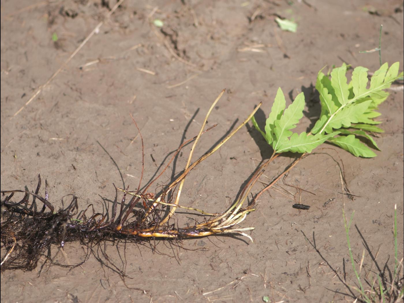 2. Creuser et enlever les rhizomes et les racines des plants. L’arrachage des rhizomes est difficile lorsque les plants sont présents dans les champs de canneberges, le désherbage manuel n’exerce alors qu’un contrôle temporaire.