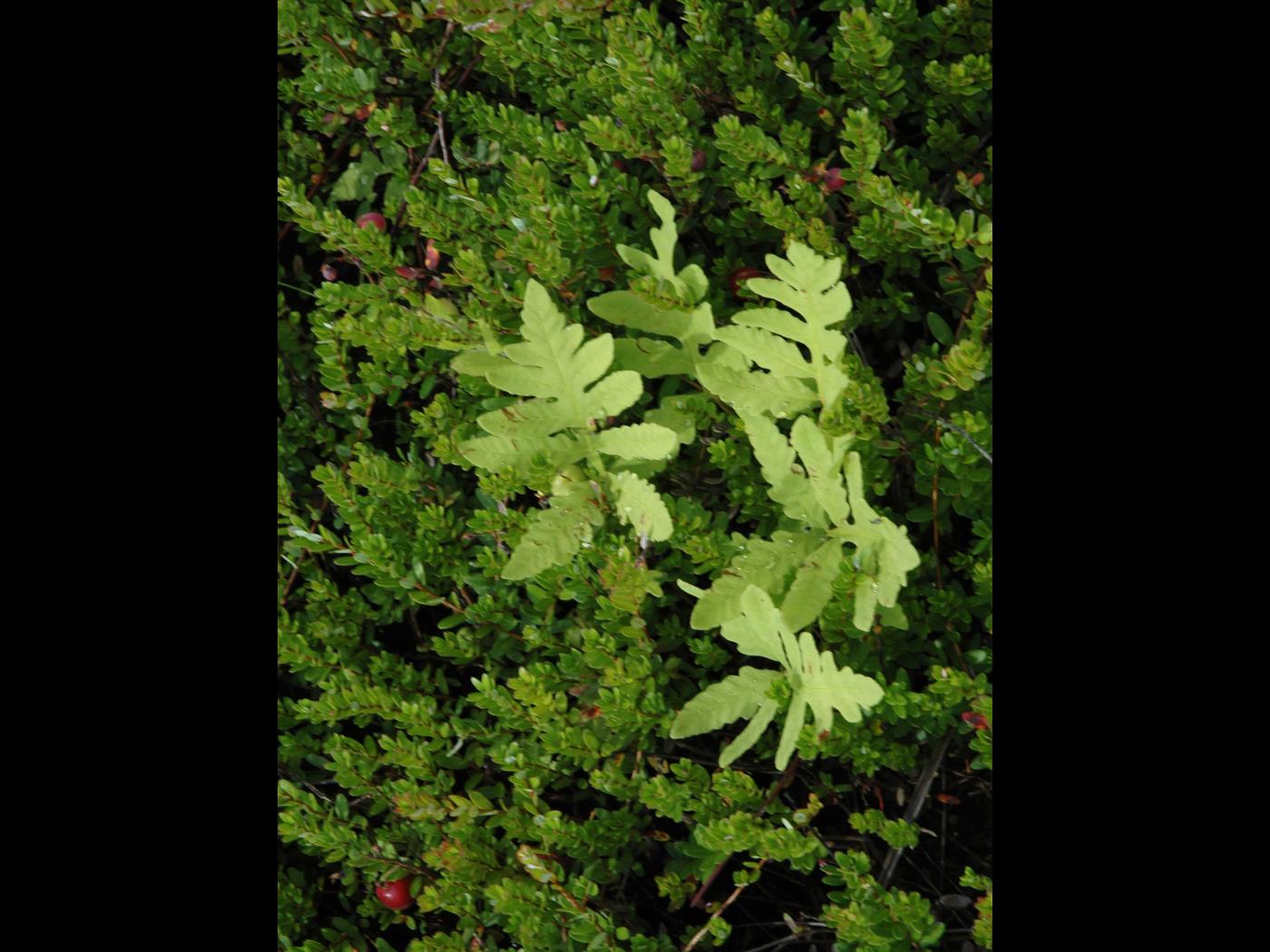 Les frondes végétatives sont de forme triangulaire et de couleur vert jaunâtre. Le limbe mesure de 15 à 40 cm de longueur et de 15 à 30 cm de largeur. Il est profondément découpé en segments étroits qui ont une marge sinuée ou lobée. La nervure centrale du limbe (rachis) est largement ailée et couverte d’écailles ou de poils blancs et épars. Le limbe est porté par un stipe aplati à la base et qui mesure de 22 à 58 cm de longueur. Les frondes végétatives ne survivent pas à l’hiver.