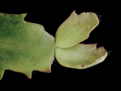 Feuilles de cactus de Noël présentant des dommages causés par des tarsonèmes : De fines gerçures beiges, très superficielles, pouvant ressembler à de petits "zippers", sont présentes sur les plus jeunes feuilles. Des tarsonèmes ont été observés directement sur la plante; ceux-ci peuvent induire ce type de malformation.