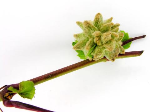 Tige de vigne présentant des dommages causés par Schizomyia vitiscoryloides. L'alimentation des larves induit la formation de galles triangulaires disposées en forme de rosette à la base des feuilles.