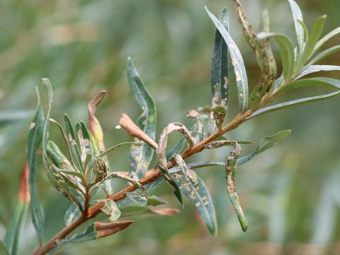 Feuillage d’argousier présentant des dommages d'alimentation causés par des scarabées japonais. Le grignotement par les adultes forme des trous irréguliers entre les nervures des feuilles. Les adultes se nourrissent également des fruits alors que les larves s'attaquent seulement aux racines.