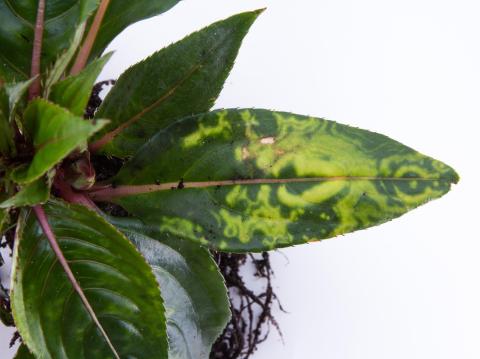 Une vue rapprochée d’une feuille d’impatiente de Nouvelle-Guinée (cv 'Celebrette Pink') montre des marbrures sur les feuilles. Des anneaux sont présents dans les régions qui portent des marbrures. Les feuilles basales et médianes sont affectées. Les tests de laboratoire (test ELISA) se sont avérés négatifs pour la détection de virus (19 virus testés). Seuls quelques plants de cette variété avaient ces symptômes.