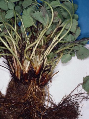 Le fraisier (cv 'Jewel') présente une importante malformation qui se caractérise par la présence de multiples collets accolés les uns sur les autres. Les feuilles sont nombreuses et petites. Ces symptômes sont caractéristiques de la maladie des collets multiples causée par un phytoplasme.