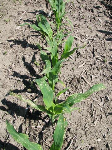 Les feuilles médianes du maïs présentent de petites taches circulaires, réparties sur le limbe à partir de l’apex. Ce symptôme serait attribuable à l’adjuvant présent dans l’herbicide Accent total (nicosulfuron / dicamba et diflufenzopyr), appliqué dans la parcelle de maïs. Ce symptôme survient en particulier lors de conditions de températures élevées, suite à l’application de l’herbicide.