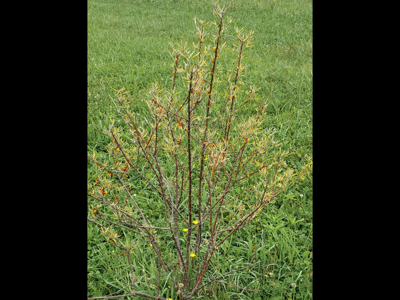 Description: Les feuilles de ce plant d'argousier sont chétives et jaunâtres.