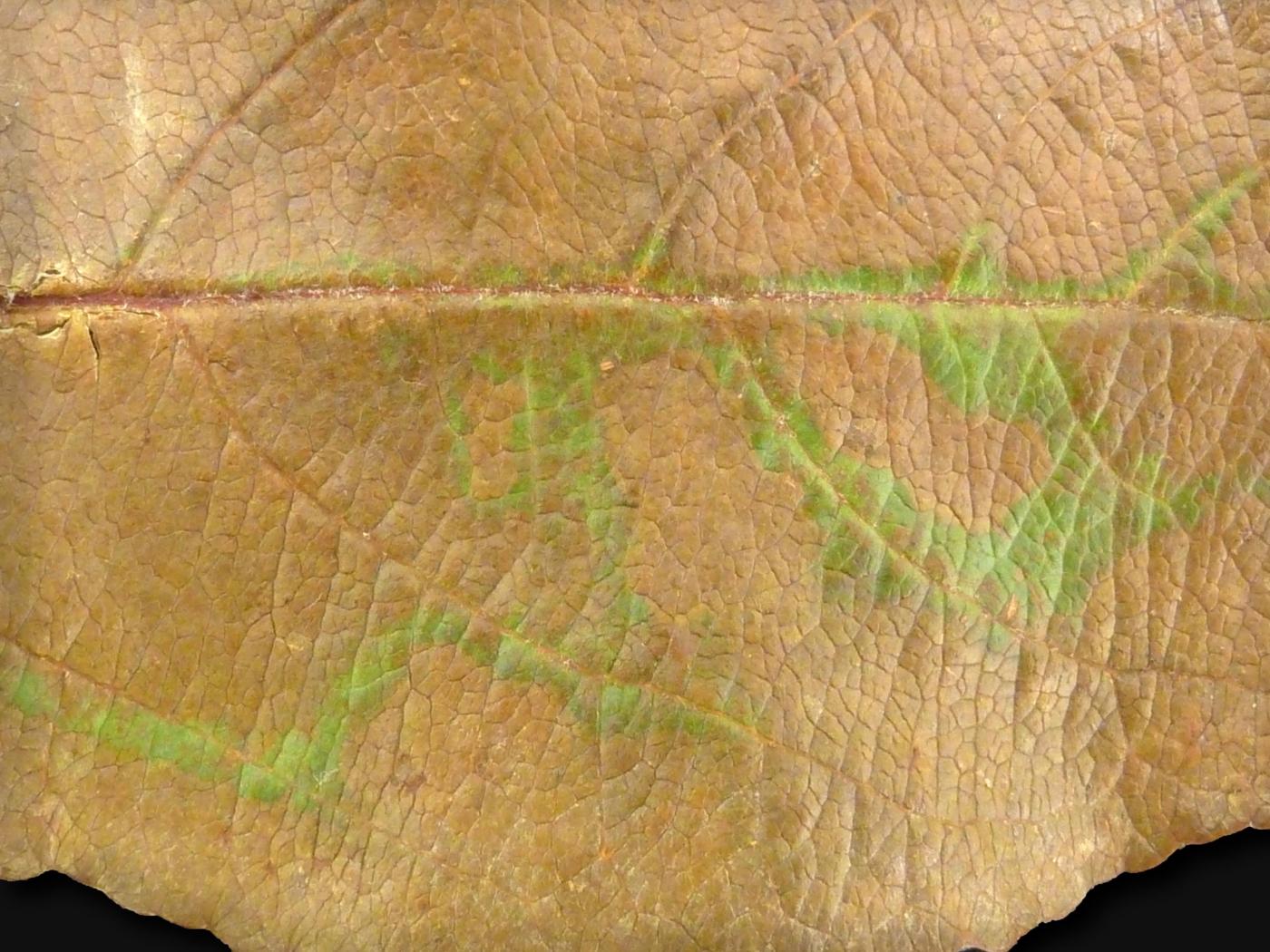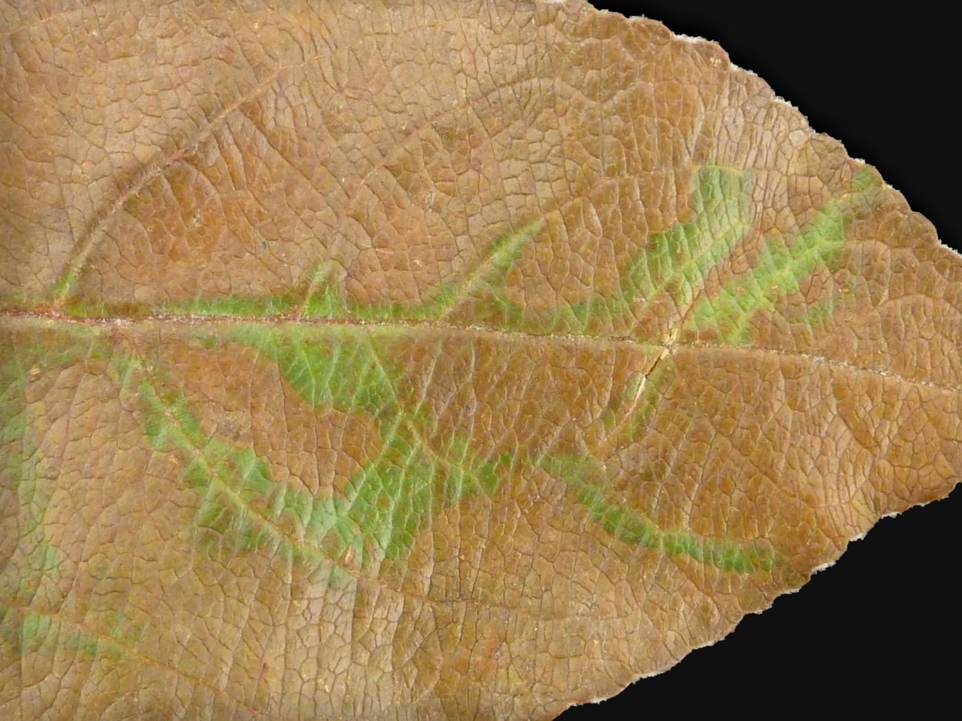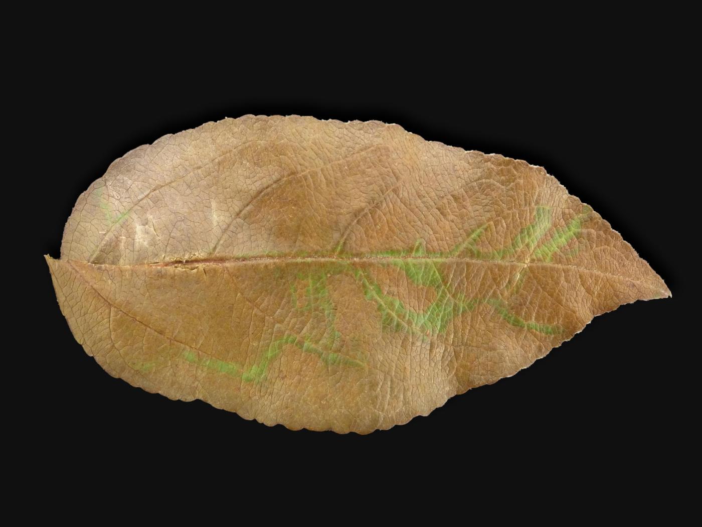 Description: Une feuille de pommier montre un brunissement sur presque tout le limbe. Seules quelques nervures sont vertes. L’analyse de la teneur en éléments minéraux des feuilles a révélé une teneur en magnésium (Mg) de 0,0951 % (951 mg/kg ou ppm). Les résultats d’analyse foliaire révèlent une carence en magnésium. La concentration adéquate de cet élément est de 0,25 à 0,40 %.