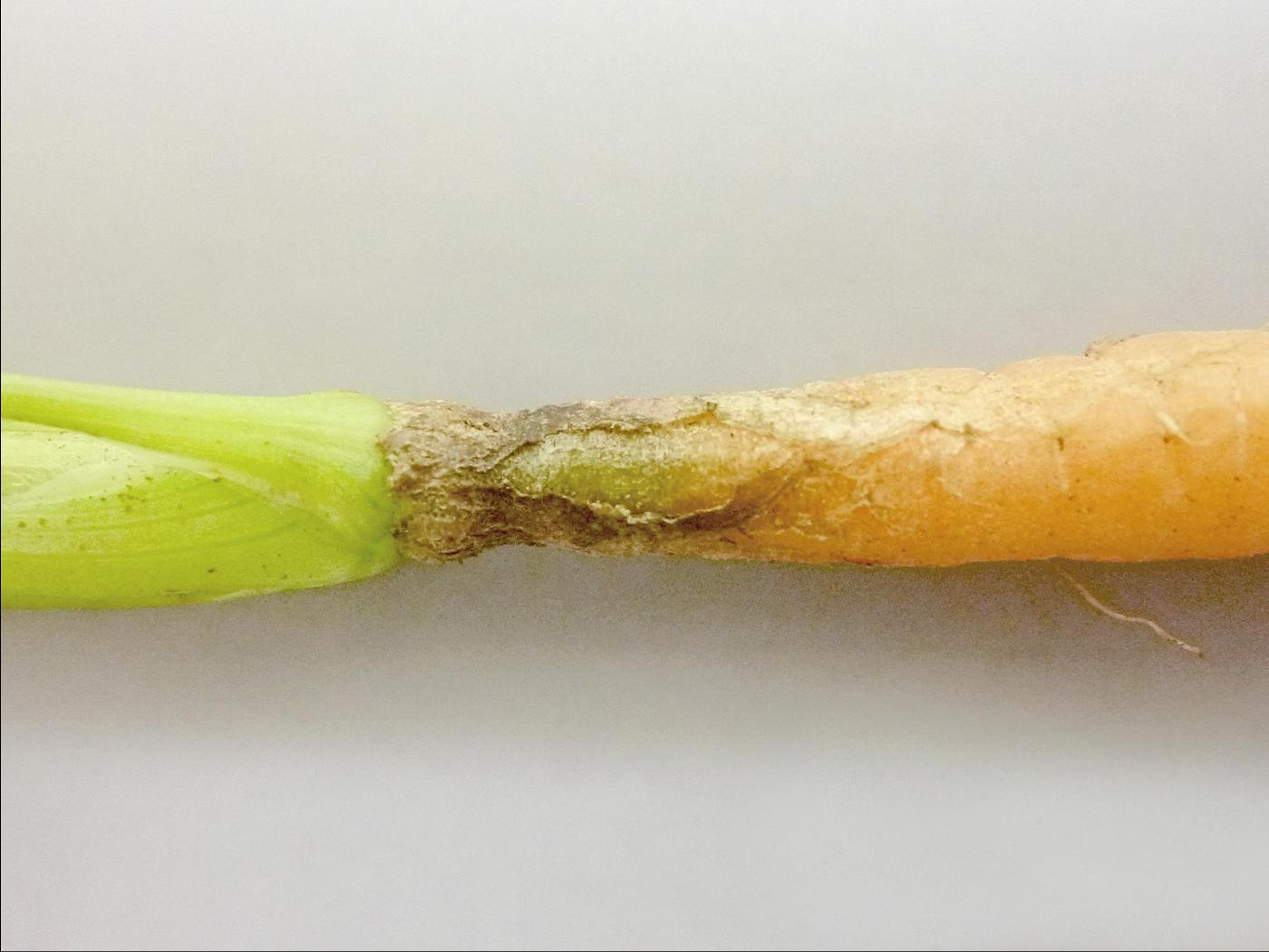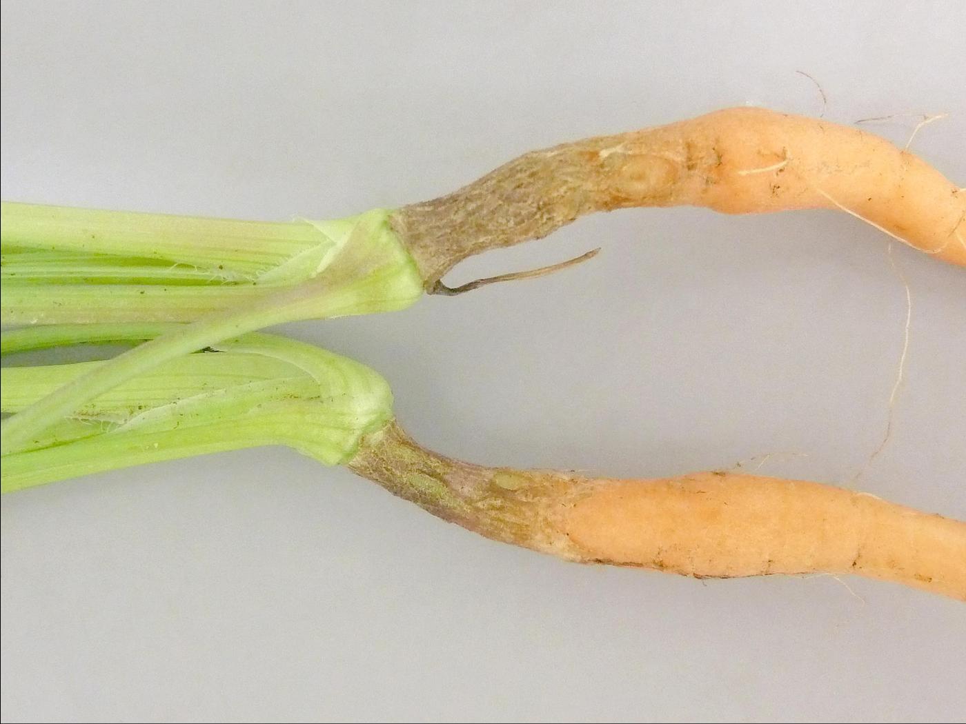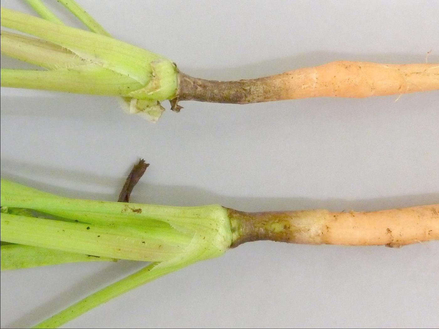 Collet : les cellules corticales sont affectées. Elles se dessèchent, changent de couleur et présentent un étranglement brunâtre, souvent d’aspect liégeux, près de la surface du sol. Parfois rupture presque complète de la racine du collet et mort de la plante.