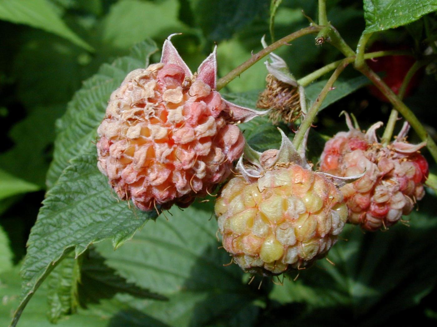 Fruit : les drupéoles sont blanches à grises, parfois brunes, ont une faible cohésion entre elles et peuvent dessécher. Calibre réduit et chute prématurée des fruits lors de la récolte.