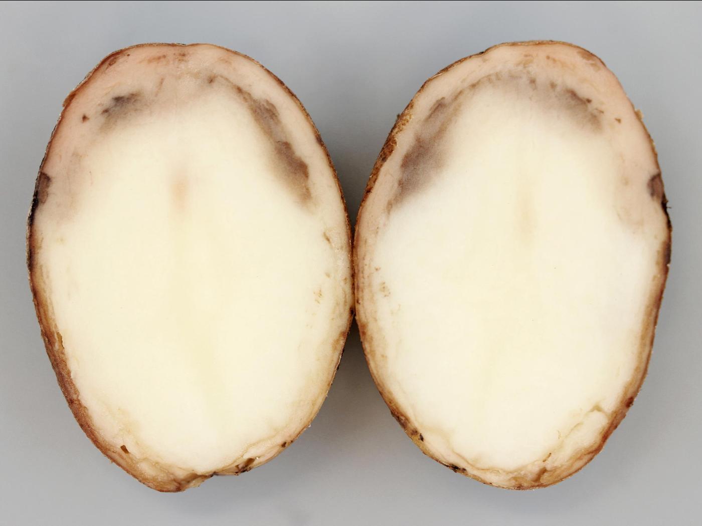 Tubercule : sur le périderme, présence de larges zones foncées, déprimées et irrégulières. Dans la chair, présence d’une coloration diffuse grise à noire avec une démarcation nette entre les tissus sains et affectés. Noircissement possible du système vasculaire.