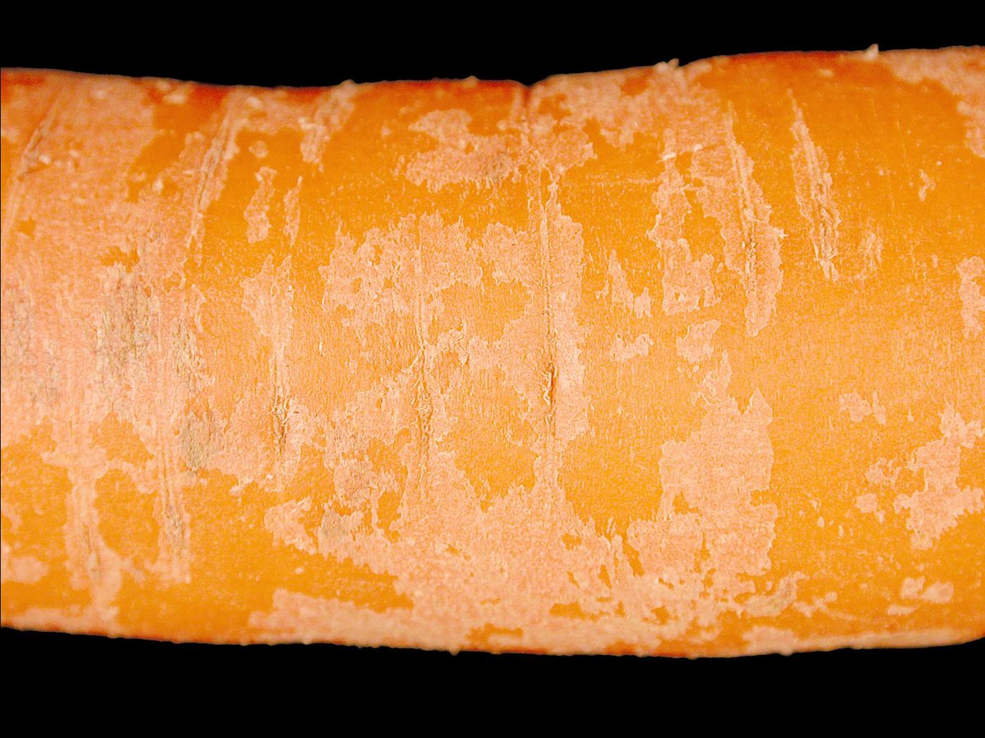Le blanchiment observé à la surface de l’épiderme de la racine est composé de cellules subérisées mortes qui se desquament. La desquamation est une réaction souvent liée aux stress du milieu ambiant notamment lorsque l’humidité relative est faible, lors de pertes d’eau ou de blessures aux carottes. Cette couche de cellules subérisées est riche en composés phénoliques qui donnent à la carotte un goût amer et un aspect desséché ou vieilli. La desquamation survient généralement après le lavage ou un entreposage prolongé. Ce problème non parasitaire est occasionnel et mineur.
