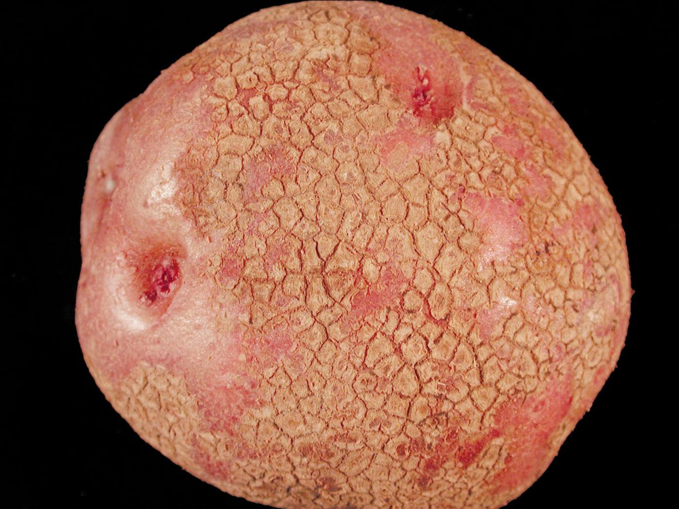 Description: Une vue rapprochée d’un tubercule de pomme de terre provenant d’un champ montre la présence de nombreuses crevasses brunes et rugueuses, à contour très angulaire, couvrant la plus grande partie de la surface du périderme. La chair est saine. Ce symptôme est caractéristique de la peau d’éléphant ou d’alligator chez la pomme de terre.