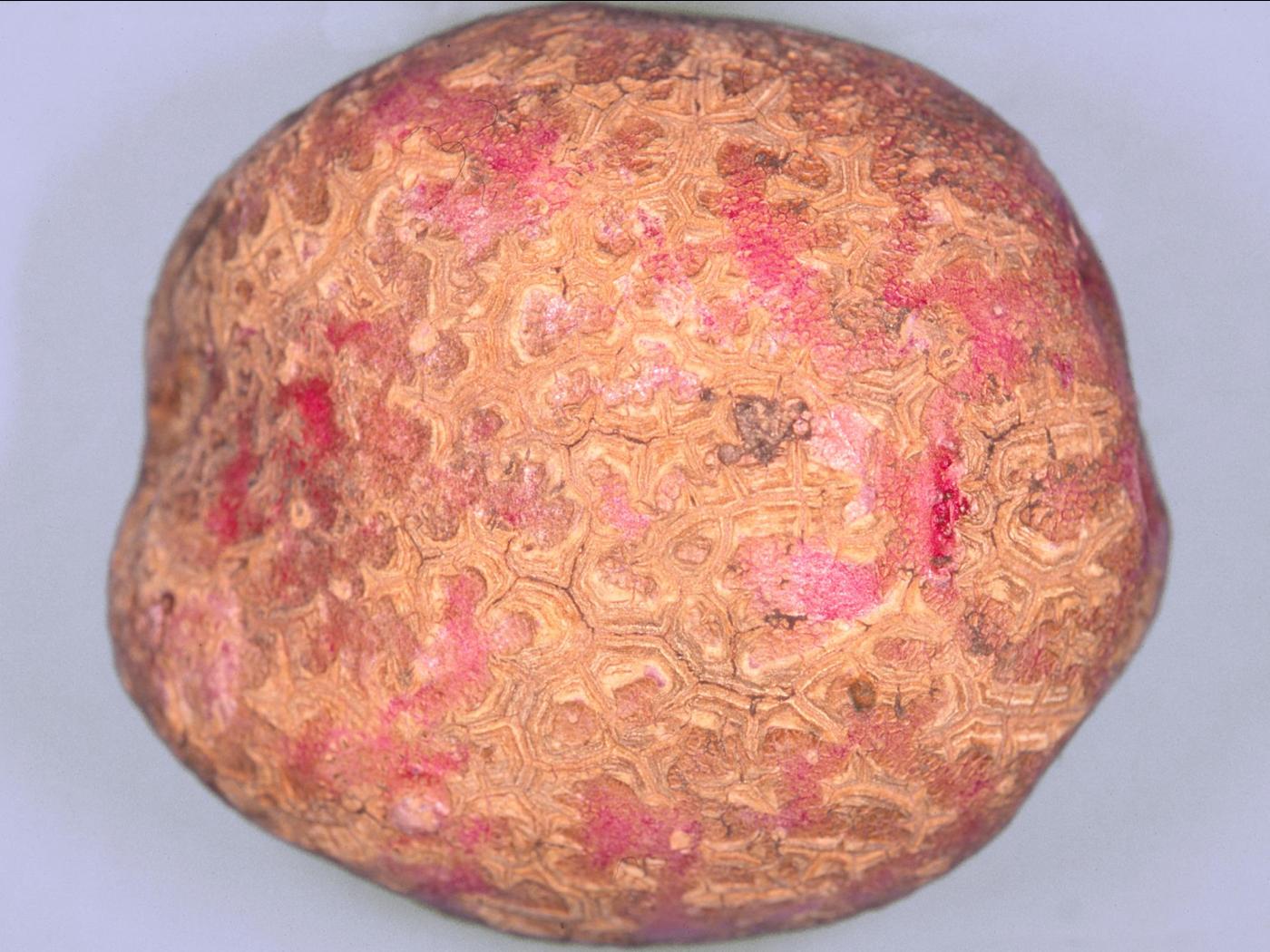 Description: Sur un tubercule de pomme de terre provenant d’un entrepôt, présence de nombreuses crevasses brunes et rugueuses, à contour très angulaire, couvrant la plus grande partie de la surface du périderme. La chair est saine. Ce symptôme est caractéristique de la peau d’éléphant ou d’alligator chez la pomme de terre. Notez que du mycélium de Rhizoctonia solani (rhizoctonie) a été détecté des crevasses, mais ce champignon ne cause pas de dommages aussi réguliers et profonds que ceux observés sur ces tub… En savoir plus